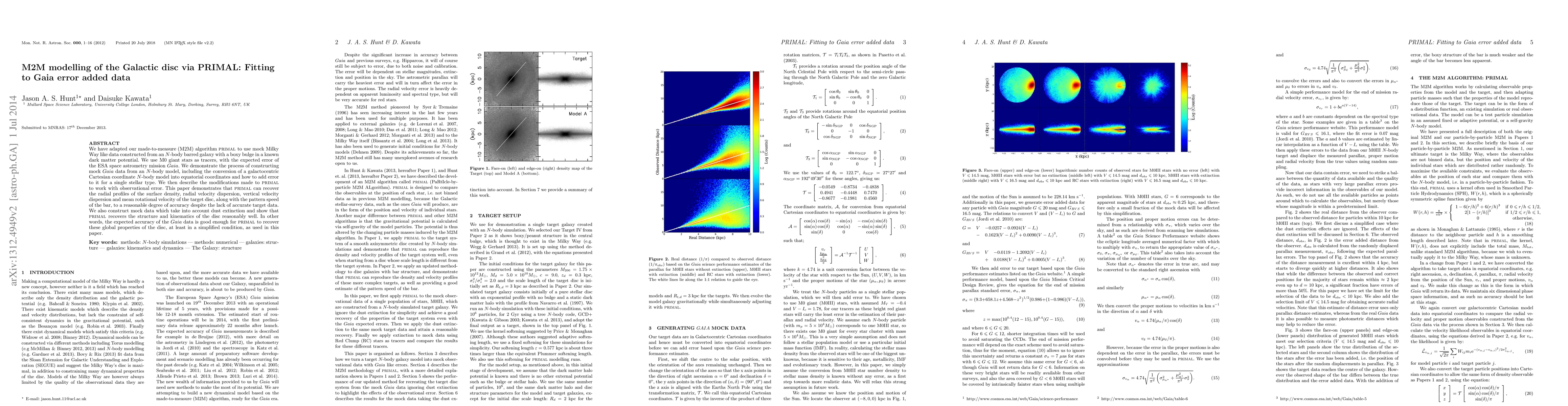 We have adapted our made-to-measure (M2M) algorithm PRIMAL to use mock Milky Way like data constructed from an N-body barred galaxy with a boxy bulge in a known dark matter potential. We use M0 giant stars as tracers, with the expected error of the ESA space astrometry mission Gaia. We demonstrate the process of constructing mock Gaia data from an N-body model, including the conversion of a galactocentric Cartesian coordinate N-body model into equatorial coordinates and how to add error to it for a single stellar type. We then describe the modifications made to PRIMAL to work with observational error. This paper demonstrates that PRIMAL can recover the radial profiles of the surface density, radial velocity dispersion, vertical velocity dispersion and mean rotational velocity of the target disc, along with the pattern speed of the bar, to a reasonable degree of accuracy despite the lack of accurate target data. We also construct mock data which take into account dust extinction and show that PRIMAL recovers the structure and kinematics of the disc reasonably well. In other words, the expected accuracy of the Gaia data is good enough for PRIMAL to recover these global properties of the disc, at least in a simplified condition, as used in this paper.