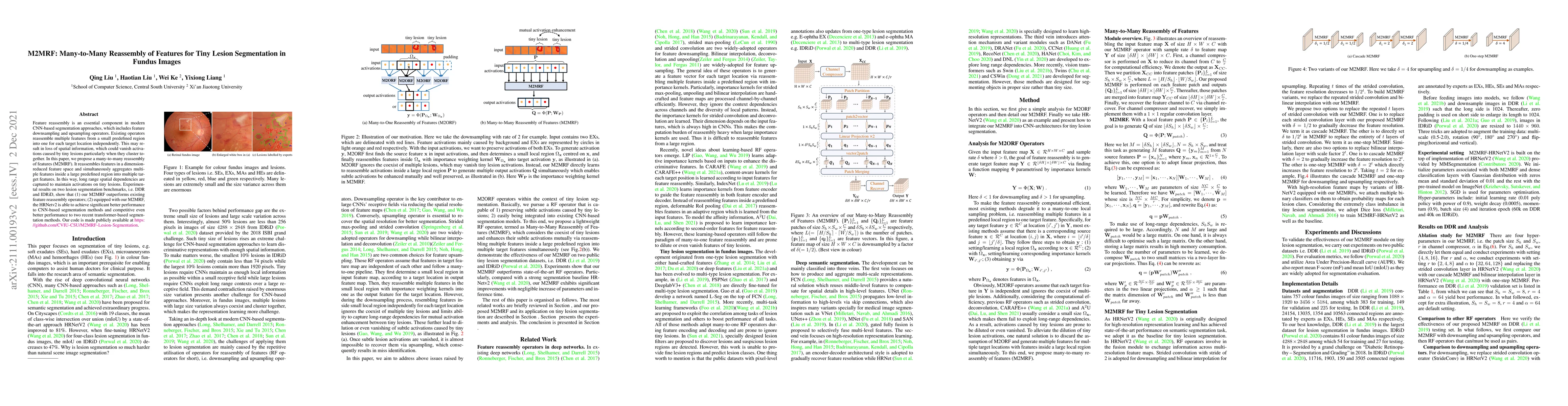 The M2MRF method improves lesion segmentation in fundus images by reassembling features in a lower-dimensional space and capturing long-range spatial dependencies, achieving better performance than existing methods.