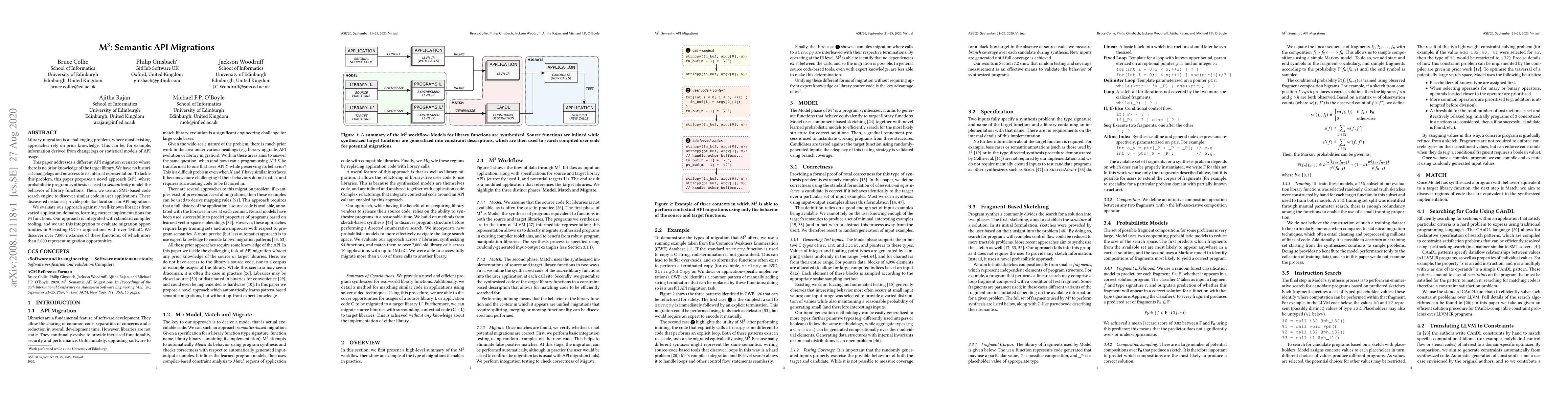 Library migration is a challenging problem, where most existing approaches rely on prior knowledge. This can be, for example, information derived from changelogs or statistical models of API usage. This paper addresses a different API migration scenario where there is no prior knowledge of the target library. We have no historical changelogs and no access to its internal representation. To tackle this problem, this paper proposes a novel approach (M$^3$), where probabilistic program synthesis is used to semantically model the behavior of library functions. Then, we use an SMT-based code search engine to discover similar code in user applications. These discovered instances provide potential locations for API migrations. We evaluate our approach against 7 well-known libraries from varied application domains, learning correct implementations for 94 functions. Our approach is integrated with standard compiler tooling, and we use this integration to evaluate migration opportunities in 9 existing C/C++ applications with over 1MLoC. We discover over 7,000 instances of these functions, of which more than 2,000 represent migration opportunities.