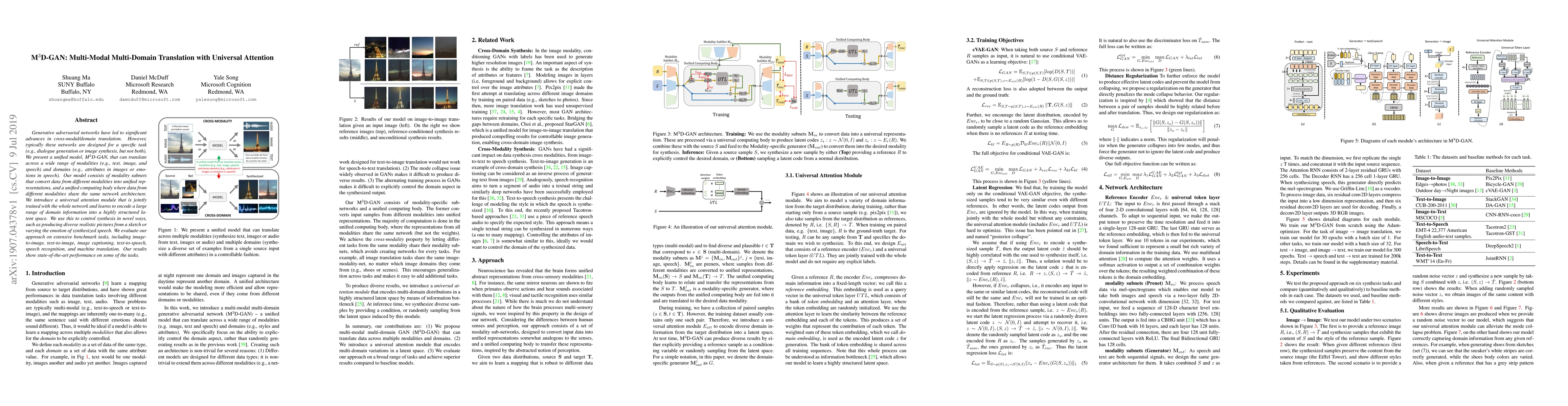 Generative adversarial networks have led to significant advances in cross-modal/domain translation. However, typically these networks are designed for a specific task (e.g., dialogue generation or image synthesis, but not both). We present a unified model, M3D-GAN, that can translate across a wide range of modalities (e.g., text, image, and speech) and domains (e.g., attributes in images or emotions in speech). Our model consists of modality subnets that convert data from different modalities into unified representations, and a unified computing body where data from different modalities share the same network architecture. We introduce a universal attention module that is jointly trained with the whole network and learns to encode a large range of domain information into a highly structured latent space. We use this to control synthesis in novel ways, such as producing diverse realistic pictures from a sketch or varying the emotion of synthesized speech. We evaluate our approach on extensive benchmark tasks, including image-to-image, text-to-image, image captioning, text-to-speech, speech recognition, and machine translation. Our results show state-of-the-art performance on some of the tasks.