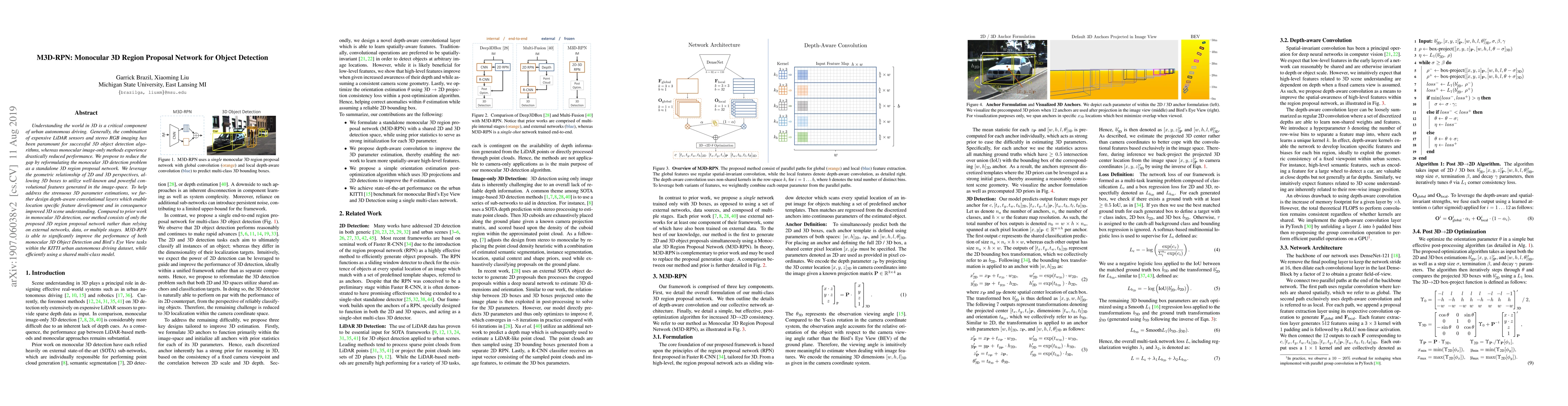 M3D-RPN proposes a standalone 3D region proposal network to enhance monocular 3D object detection, leveraging depth-aware convolutional layers for improved 3D scene understanding, outperforming prior methods within the KITTI dataset. The approach relies solely on monocular images, eliminating the need for LiDAR or stereo data.
