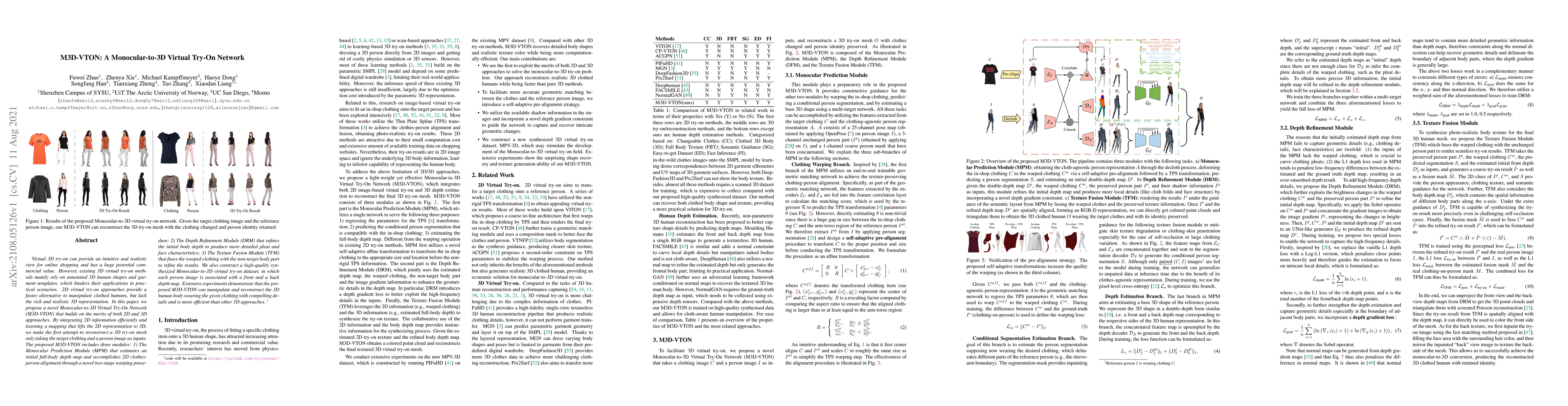 The paper proposes M3D-VTON, a Monocular-to-3D Virtual Try-On Network that reconstructs a 3D try-on mesh from a single image and clothing, integrating 2D and 3D virtual try-on benefits. The network includes modules for initial depth estimation, depth refinement, and texture fusion, and is validated with a new synthesized dataset.