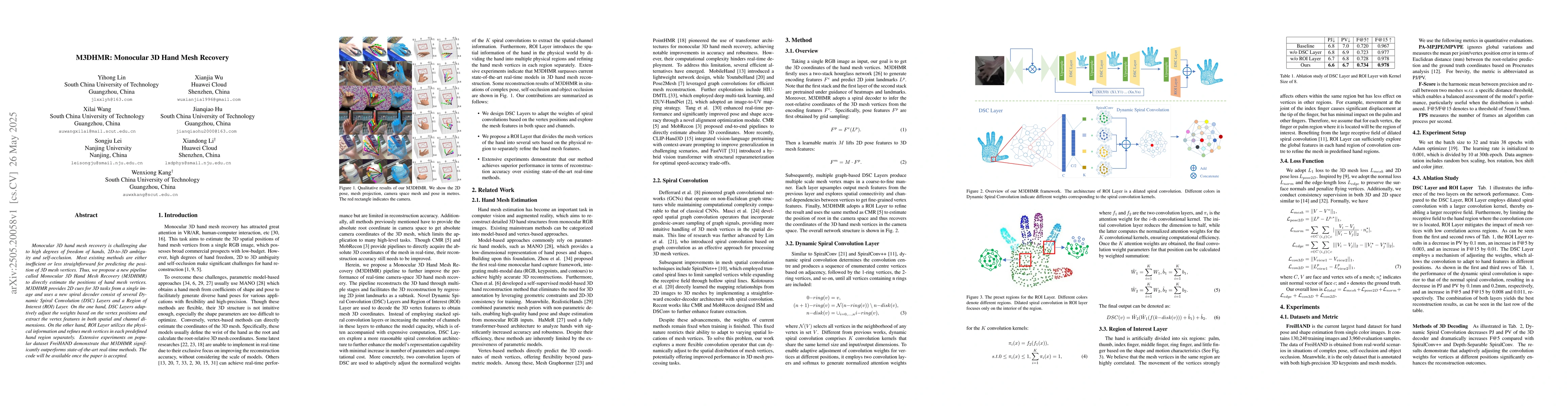 The research proposes M3DHMR, a pipeline for monocular 3D hand mesh recovery. It utilizes 2D cues from a single image and incorporates a spiral decoder with Dynamic Spiral Convolution (DSC) Layers and a Region of Interest (ROI) Layer to adaptively adjust weights and refine mesh vertices in predefined hand regions.