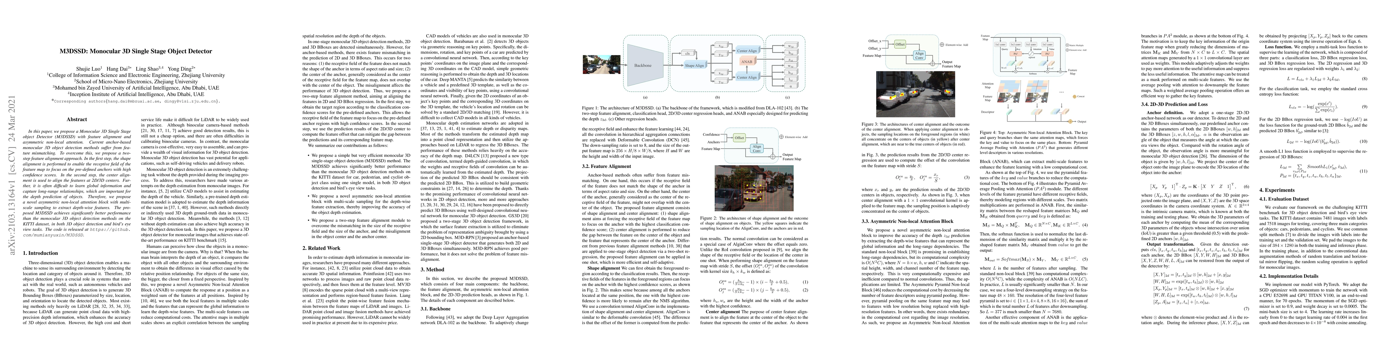 The paper introduces M3DSSD, a monocular 3D single-stage object detector that employs feature alignment and asymmetric non-local attention to address feature mismatching. The method significantly outperforms existing methods on the KITTI dataset for 3D object detection and bird's eye view tasks.