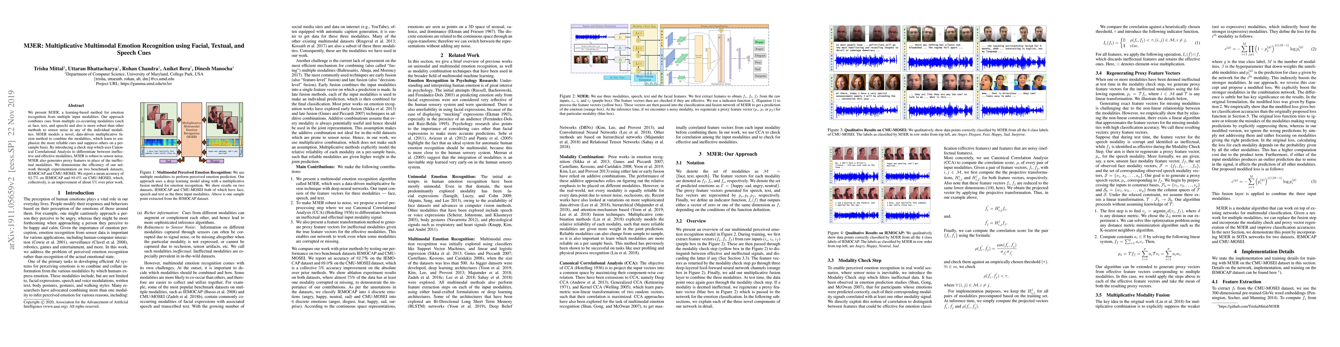 M3ER is a learning-based method for emotion recognition that integrates facial, textual, and speech cues. It employs a data-driven multiplicative fusion technique to emphasize reliable cues and suppress noisy inputs, achieving a mean accuracy of 82.7% on IEMOCAP and 89.0% on CMU-MOSEI, outperforming previous methods by about 5%.