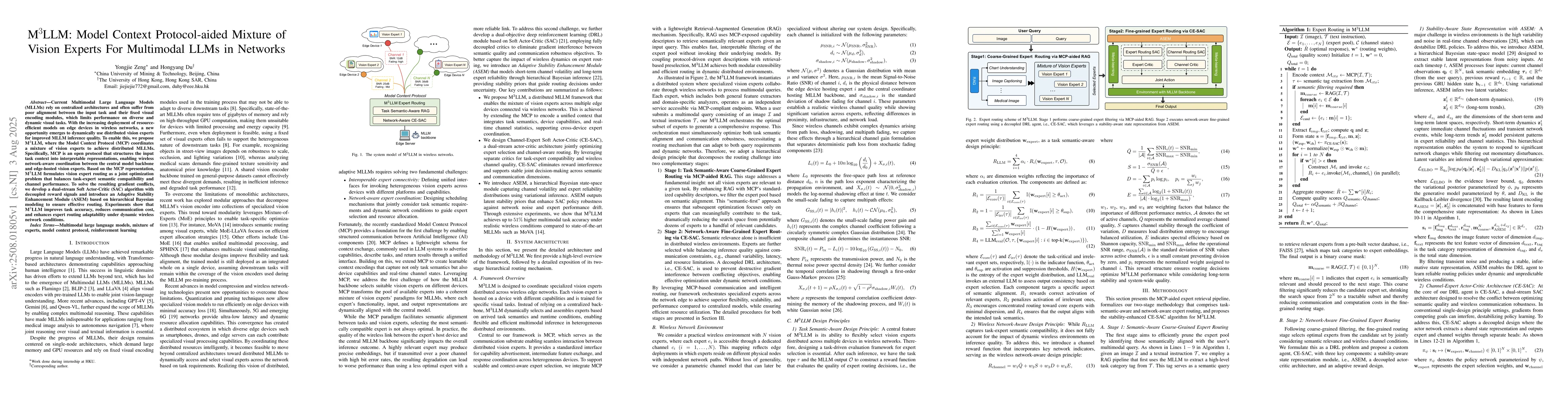 Current Multimodal Large Language Models (MLLMs) rely on centralized architectures and often suffer from poor alignment between the input task and their fixed visual encoding modules, which limits performance on diverse and dynamic visual tasks. With the increasing deployment of resource-efficient models on edge devices in wireless networks, a new opportunity emerges to dynamically use distributed vision experts for improved MLLM inference quality. To enable this, we propose M3LLM, where the Model Context Protocol (MCP) coordinates a mixture of vision experts to achieve distributed MLLMs. Specifically, MCP is an open protocol that structures the input task context into interpretable representations, enabling wireless network-aware coordination between the central model backbone and edge-hosted vision experts. Based on the MCP representation, M3LLM formulates vision expert routing as a joint optimization problem that balances task-expert semantic compatibility and channel performance. To solve the resulting gradient conflicts, we develop a dual-stream Soft Actor-Critic (SAC) algorithm with decoupled reward signals and introduce an Adaptive Stability Enhancement Module (ASEM) based on hierarchical Bayesian modeling to ensure effective routing. Experiments show that M3LLM improves task accuracy, reduces communication cost, and enhances expert routing adaptability under dynamic wireless network conditions.