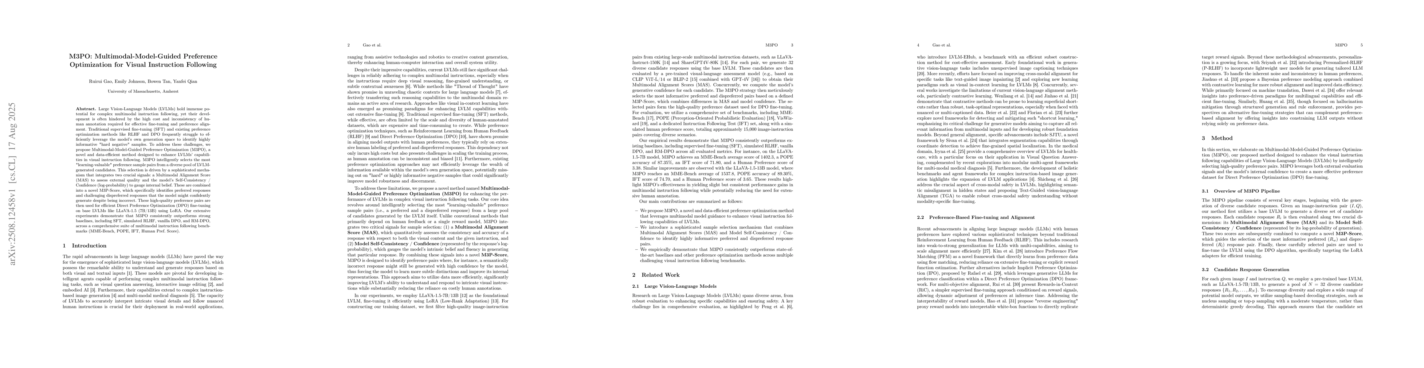 Large Vision-Language Models (LVLMs) hold immense potential for complex multimodal instruction following, yet their development is often hindered by the high cost and inconsistency of human annotation required for effective fine-tuning and preference alignment. Traditional supervised fine-tuning (SFT) and existing preference optimization methods like RLHF and DPO frequently struggle to efficiently leverage the model's own generation space to identify highly informative "hard negative" samples. To address these challenges, we propose Multimodal-Model-Guided Preference Optimization (M3PO), a novel and data-efficient method designed to enhance LVLMs' capabilities in visual instruction following. M3PO intelligently selects the most "learning-valuable" preference sample pairs from a diverse pool of LVLM-generated candidates. This selection is driven by a sophisticated mechanism that integrates two crucial signals: a Multimodal Alignment Score (MAS) to assess external quality and the model's Self-Consistency / Confidence (log-probability) to gauge internal belief. These are combined into a novel M3P-Score, which specifically identifies preferred responses and challenging dispreferred responses that the model might confidently generate despite being incorrect. These high-quality preference pairs are then used for efficient Direct Preference Optimization (DPO) fine-tuning on base LVLMs like LLaVA-1.5 (7B/13B) using LoRA. Our extensive experiments demonstrate that M3PO consistently outperforms strong baselines, including SFT, simulated RLHF, vanilla DPO, and RM-DPO, across a comprehensive suite of multimodal instruction following benchmarks (MME-Bench, POPE, IFT, Human Pref. Score).