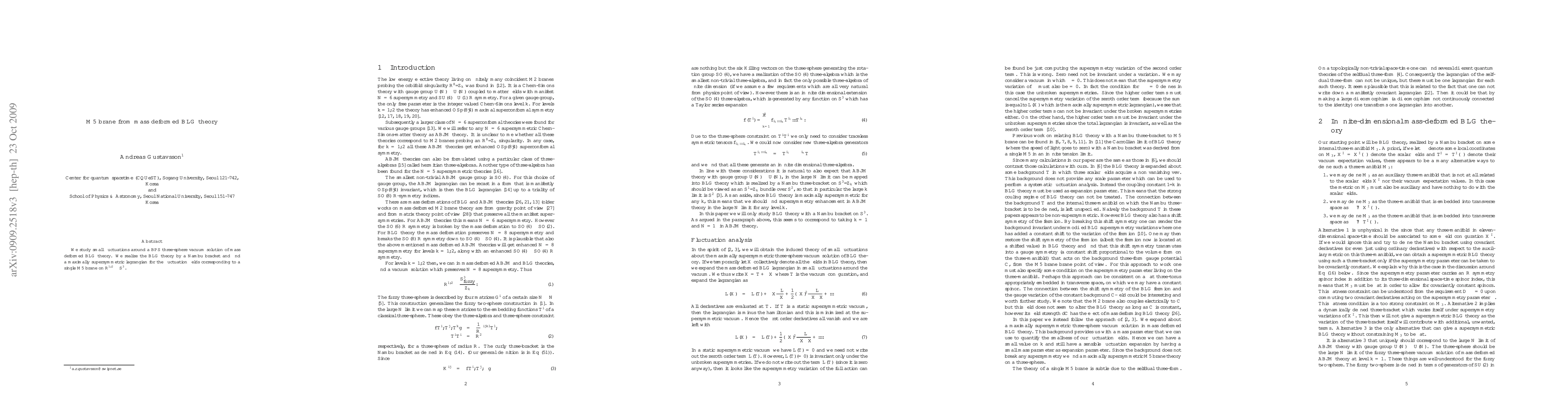 This research investigates small fluctuations around a BPS three-sphere in mass-deformed BLG theory, utilizing a Nambu bracket to derive a maximally supersymmetric Lagrangian describing a single M5 brane in $\mb{R}^{1,2}\times S^3$. The study focuses on the theoretical framework for understanding M5 branes in this context.