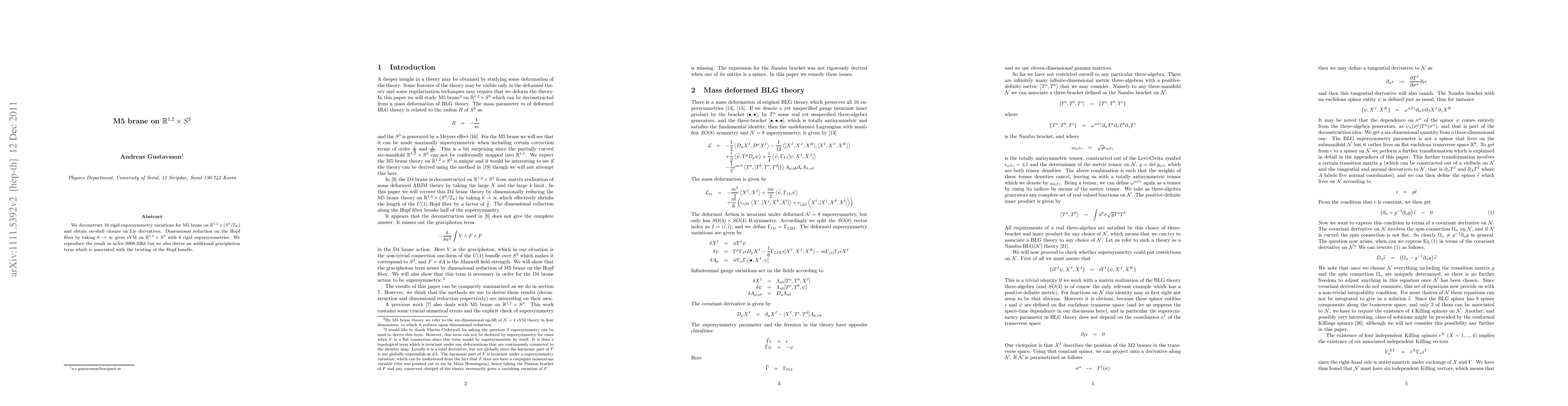 We deconstruct 16 rigid supersymmetry variations for M5 brane on $\mb{R}^{1,2}\times (S^3/{\mb{Z}_k})$ and obtain on-shell closure on Lie derivatives. Dimensional reduction on the Hopf fiber by taking $k\rightarrow \infty$ gives sYM on ${\mb{R}}^{1,2} \times S^2$ with 8 rigid supersymmetries. We reproduce the result in arXiv:0908.3263 but we also derive an additional graviphoton term which is associated with the twisting of the Hopf bundle.