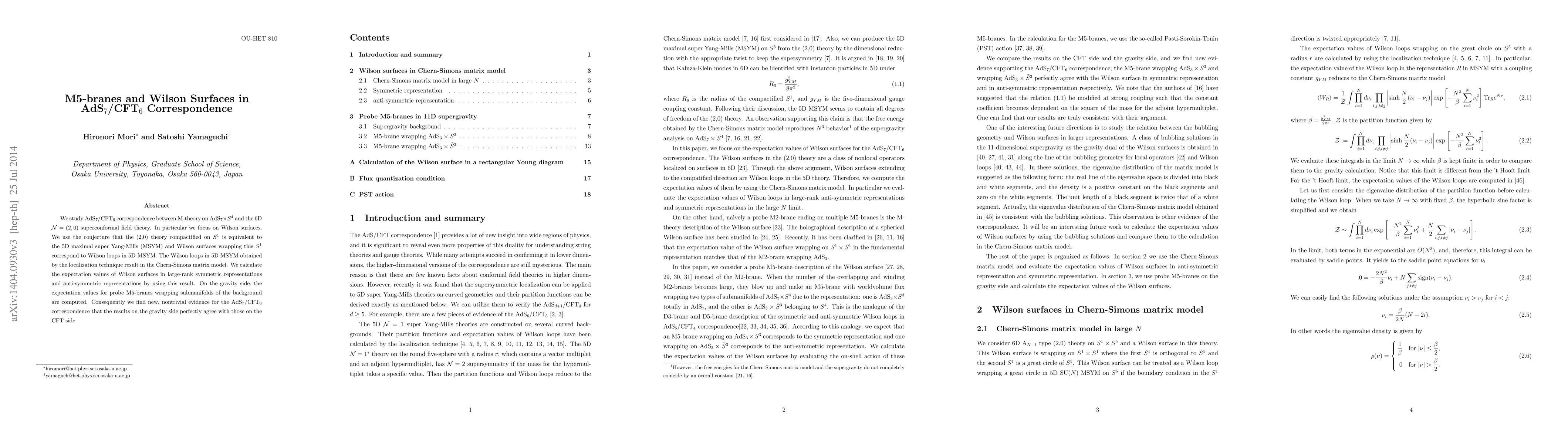We study AdS$_{7}$/CFT$_{6}$ correspondence between M-theory on AdS$_{7} \times S^{4}$ and the 6D $\mathcal{N} = (2,0)$ superconformal field theory. In particular we focus on Wilson surfaces. We use the conjecture that the (2,0) theory compactified on $S^{1}$ is equivalent to the 5D maximal super Yang-Mills (MSYM) and Wilson surfaces wrapping this $S^1$ correspond to Wilson loops in 5D MSYM. The Wilson loops in 5D MSYM obtained by the localization technique result in the Chern-Simons matrix model. We calculate the expectation values of Wilson surfaces in large rank symmetric representations and anti-symmetric representations by using this result. In the gravity side, the expectation values for probe M5-branes wrapping submanifolds of the background are computed. Consequently we find new, non-trivial evidence for the AdS$_{7}$/CFT$_{6}$ correspondence that the results in the gravity side perfectly agree with those in the CFT side.
