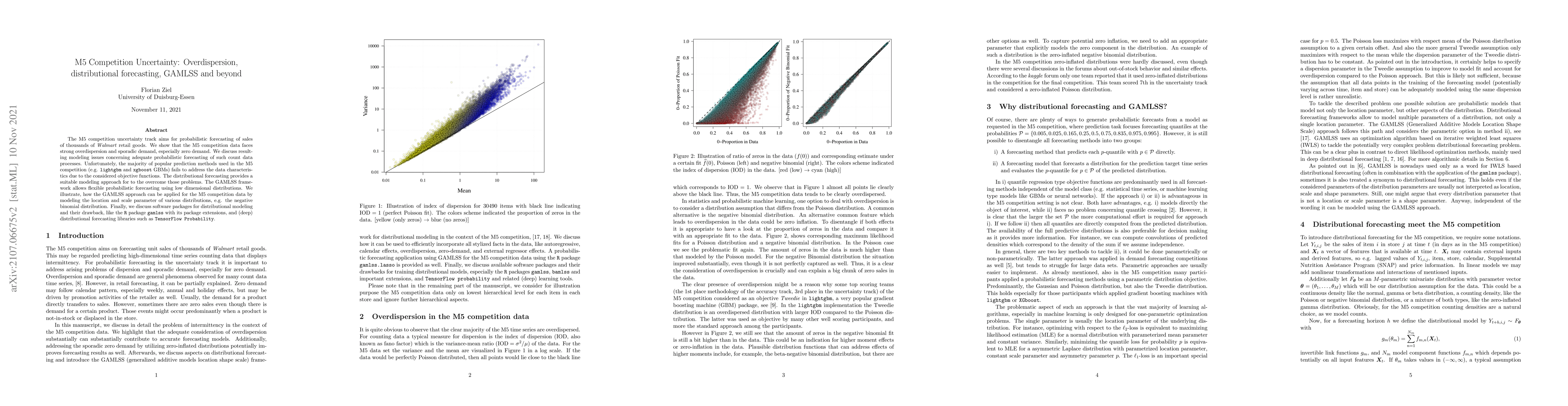 The M5 competition uncertainty track focuses on probabilistic forecasting of Walmart sales data, highlighting strong overdispersion and sporadic zero demand. Traditional methods like GBMs fail to address these issues, but the GAMLSS framework offers flexible probabilistic forecasting, modeling both location and scale parameters of distributions like the negative binomial.