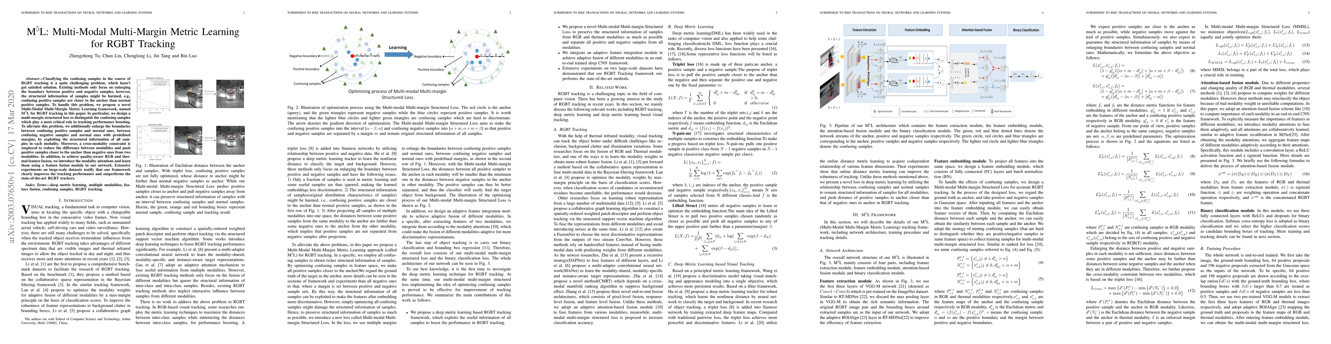 Classifying the confusing samples in the course of RGBT tracking is a quite challenging problem, which hasn't got satisfied solution. Existing methods only focus on enlarging the boundary between positive and negative samples, however, the structured information of samples might be harmed, e.g., confusing positive samples are closer to the anchor than normal positive samples.To handle this problem, we propose a novel Multi-Modal Multi-Margin Metric Learning framework, named M$^5$L for RGBT tracking in this paper. In particular, we design a multi-margin structured loss to distinguish the confusing samples which play a most critical role in tracking performance boosting. To alleviate this problem, we additionally enlarge the boundaries between confusing positive samples and normal ones, between confusing negative samples and normal ones with predefined margins, by exploiting the structured information of all samples in each modality.Moreover, a cross-modality constraint is employed to reduce the difference between modalities and push positive samples closer to the anchor than negative ones from two modalities.In addition, to achieve quality-aware RGB and thermal feature fusion, we introduce the modality attentions and learn them using a feature fusion module in our network. Extensive experiments on large-scale datasets testify that our framework clearly improves the tracking performance and outperforms the state-of-the-art RGBT trackers.