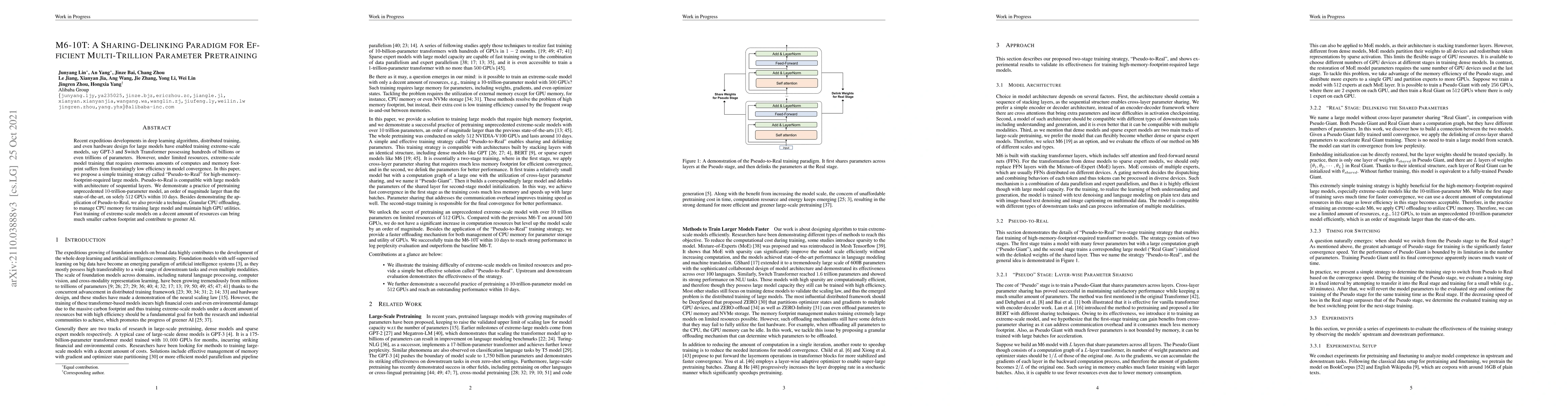 This paper introduces a new training strategy, 'Pseudo-to-Real', for large models with sequential architectures, enabling the pretraining of a 10-trillion-parameter model in 10 days on just 512 GPUs. It also presents Granular CPU offloading for efficient CPU memory management, promoting greener AI through reduced resource usage.