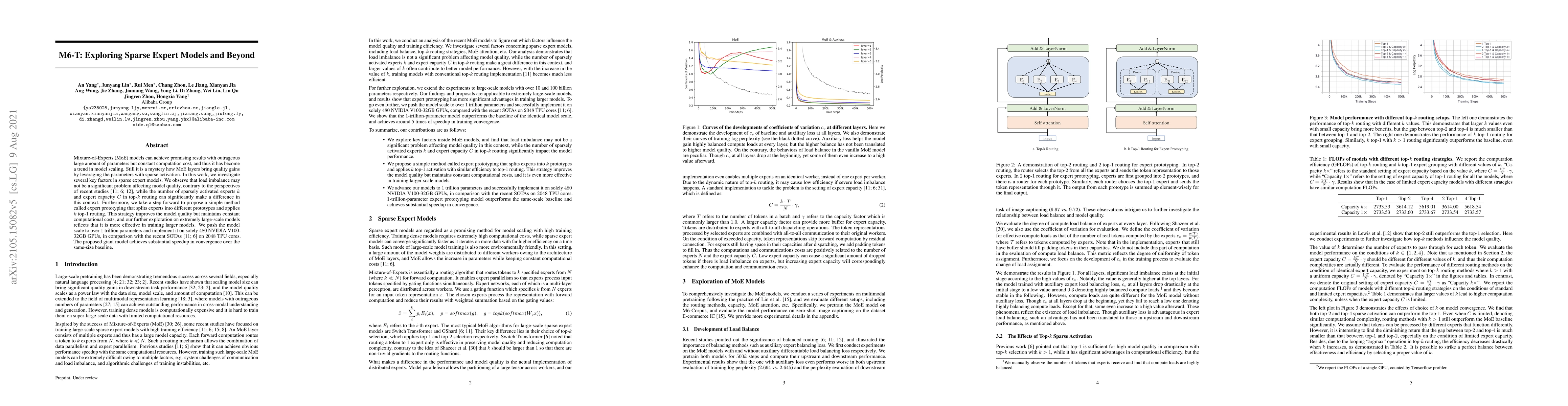 Mixture-of-Experts (MoE) models can achieve promising results with outrageous large amount of parameters but constant computation cost, and thus it has become a trend in model scaling. Still it is a mystery how MoE layers bring quality gains by leveraging the parameters with sparse activation. In this work, we investigate several key factors in sparse expert models. We observe that load imbalance may not be a significant problem affecting model quality, contrary to the perspectives of recent studies, while the number of sparsely activated experts $k$ and expert capacity $C$ in top-$k$ routing can significantly make a difference in this context. Furthermore, we take a step forward to propose a simple method called expert prototyping that splits experts into different prototypes and applies $k$ top-$1$ routing. This strategy improves the model quality but maintains constant computational costs, and our further exploration on extremely large-scale models reflects that it is more effective in training larger models. We push the model scale to over $1$ trillion parameters and implement it on solely $480$ NVIDIA V100-32GB GPUs, in comparison with the recent SOTAs on $2048$ TPU cores. The proposed giant model achieves substantial speedup in convergence over the same-size baseline.