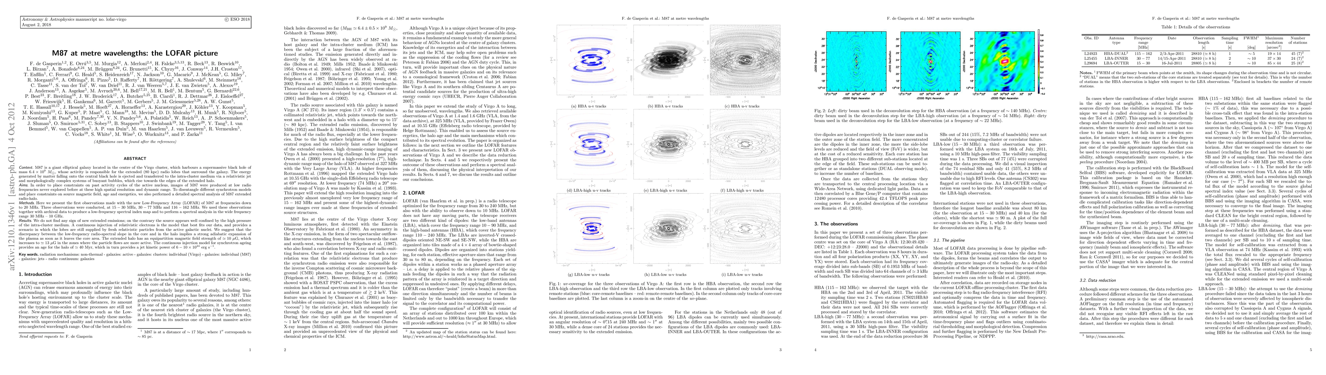 M87 is a giant elliptical galaxy located in the centre of the Virgo cluster, which harbours a supermassive black hole of mass 6.4x10^9 M_sun, whose activity is responsible for the extended (80 kpc) radio lobes that surround the galaxy. The energy generated by matter falling onto the central black hole is ejected and transferred to the intra-cluster medium via a relativistic jet and morphologically complex systems of buoyant bubbles, which rise towards the edges of the extended halo. Here we present the first observations made with the new Low-Frequency Array (LOFAR) of M87 at frequencies down to 20 MHz. Images of M87 were produced at low radio frequencies never explored before at these high spatial resolution and dynamic range. To disentangle different synchrotron models and place constraints on source magnetic field, age and energetics, we also performed a detailed spectral analysis of M87 extended radio-halo using these observations together with archival data. We do not find any sign of new extended emissions; on the contrary the source appears well confined by the high pressure of the intra-cluster medium. A continuous injection of relativistic electrons is the model that best fits our data, and provides a scenario in which the lobes are still supplied by fresh relativistic particles from the active galactic nuclei. We suggest that the discrepancy between the low-frequency radio-spectral slope in the core and in the halo implies a strong adiabatic expansion of the plasma as soon as it leaves the core area. The extended halo has an equipartition magnetic field strength of ~10 uG, which increases to ~13 uG in the zones where the particle flows are more active. The continuous injection model for synchrotron ageing provides an age for the halo of ~40 Myr, which in turn provides a jet kinetic power of 6-10x10^44 erg/s.