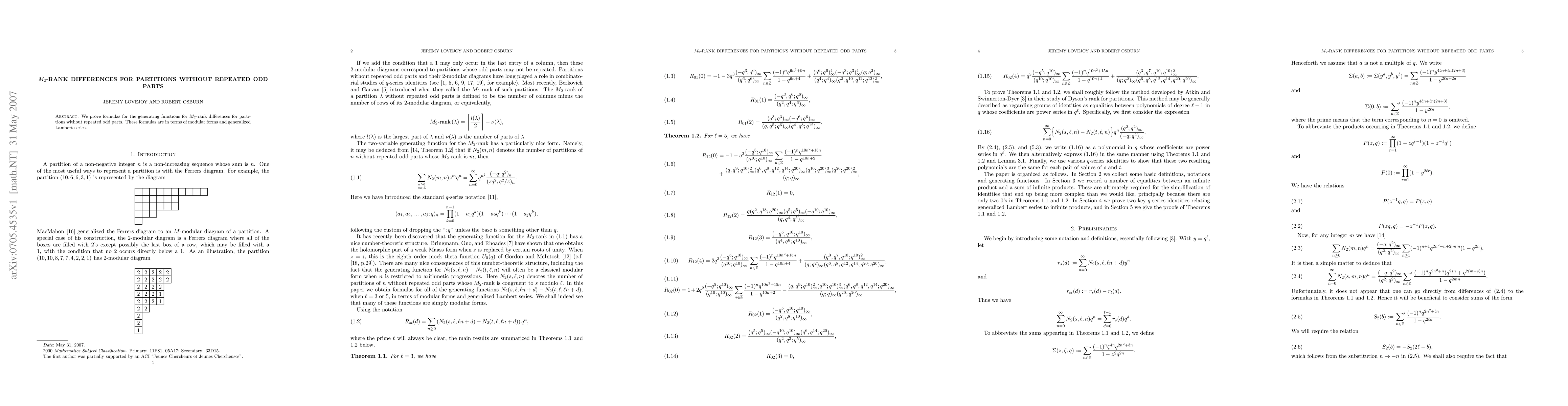 This paper establishes generating function formulas for M_2-rank differences in partitions that exclude repeated odd parts, expressed through modular forms and generalized Lambert series. These results provide insights into the structure and properties of such partitions.