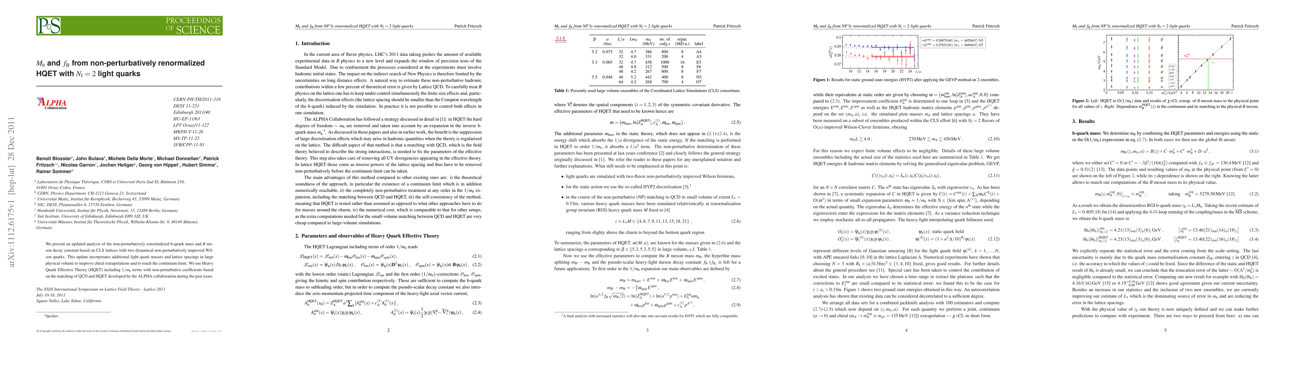This paper updates the non-perturbatively renormalized b-quark mass (M_b) and B meson decay constant (f_B) using lattice QCD with two dynamical quarks, incorporating improved chiral extrapolations and larger physical volumes. The analysis employs Heavy Quark Effective Theory (HQET) with 1/m_b terms and non-perturbative coefficients from the ALPHA collaboration.