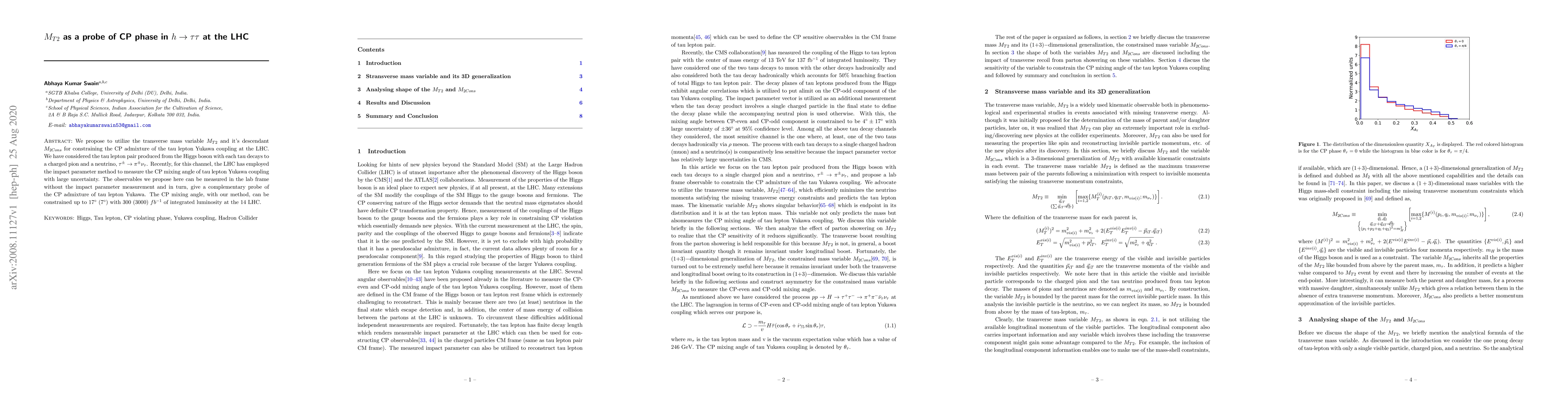 We propose to utilize the transverse mass variable $M_{T2}$ and it's descendant $M_{2Cons}$ for constraining the CP admixture of the tau lepton Yukawa coupling at the LHC. We have considered the tau lepton pair produced from the Higgs boson with each tau decays to a charged pion and a neutrino, $\tau^{\pm} \rightarrow \pi^{\pm} \nu_{\tau}$. Recently, for this channel, the LHC has employed the impact parameter method to measure the CP mixing angle of tau lepton Yukawa coupling with large uncertainty. The observables we propose here can be measured in the lab frame without the impact parameter measurement and in turn, give a complementary probe of the CP admixture of tau lepton Yukawa. The CP mixing angle, with our method, can be constrained up to 17$^{\circ}$ (7$^{\circ}$) with 300 (3000) $fb^{-1}$ of integrated luminosity at the 14 LHC.