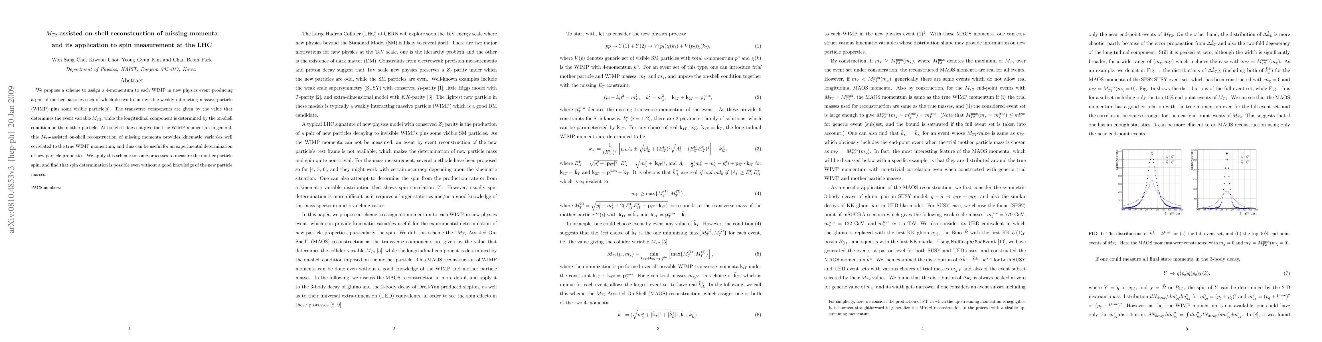 We propose a scheme to assign a 4-momentum to each WIMP in new physics event producing a pair of mother particles each of which decays to an invisible weakly interacting massive particle (WIMP) plus some visible particle(s). The transverse components are given by the value that determines the event variable M_T2, while the longitudinal component is determined by the on-shell condition on the mother particle. Although it does not give the true WIMP momentum in general, this M_T2-assisted on-shell reconstruction of missing momenta provides kinematic variables well correlated to the true WIMP momentum, and thus can be useful for an experimental determination of new particle properties. We apply this scheme to some processes to measure the mother particle spin, and find that spin determination is possible even without a good knowledge of the new particle masses.