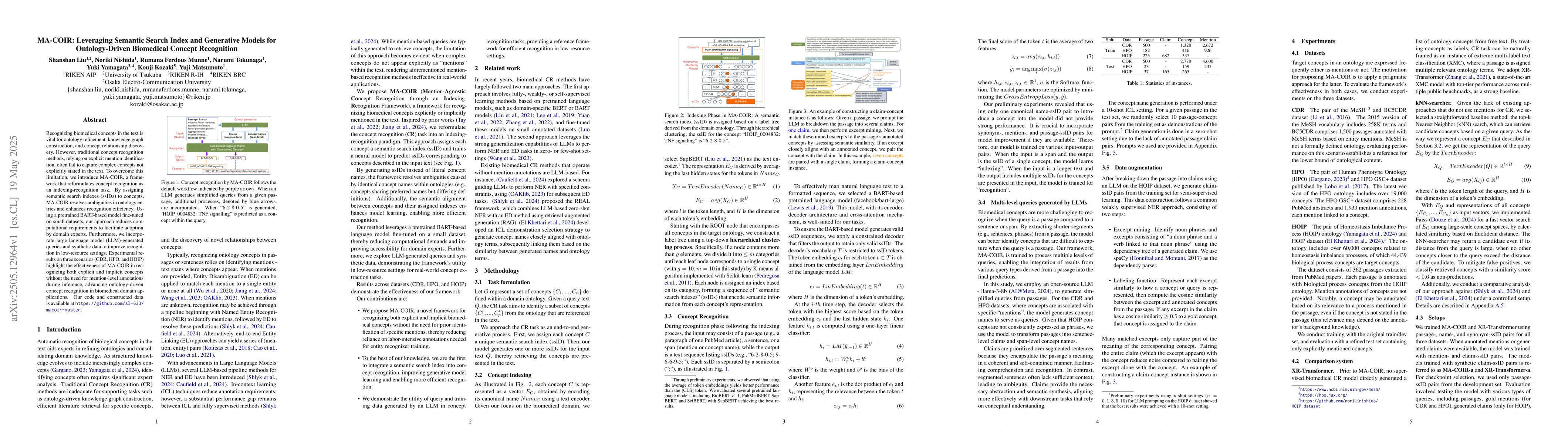 The introduction of MA-COIR, a framework that leverages semantic search indexes and generative models for ontology-driven biomedical concept recognition, enhancing recognition efficiency and reducing computational requirements.