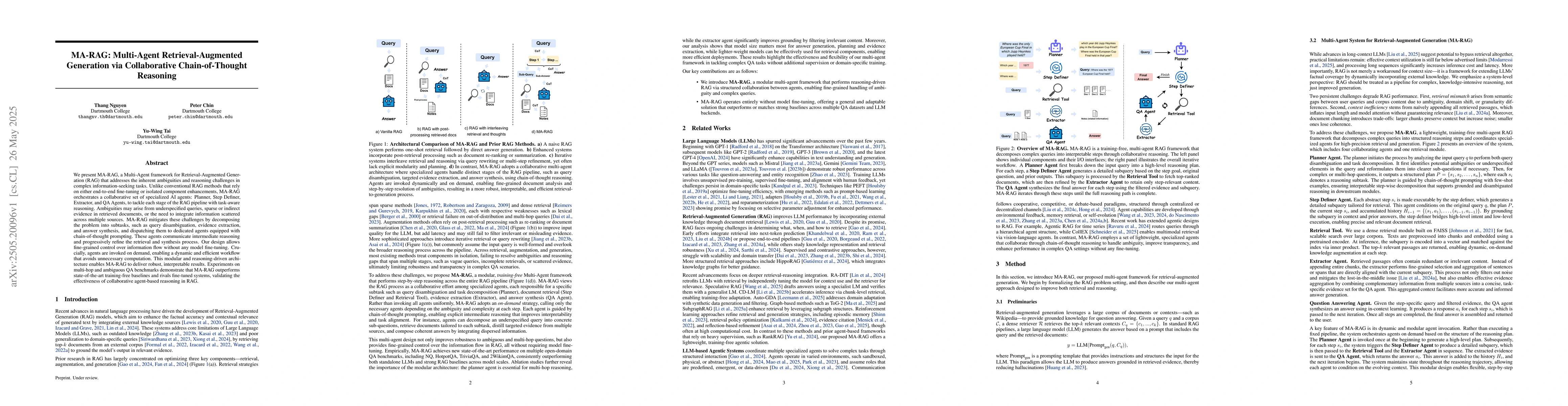 MA-RAG employs a Multi-Agent framework for Retrieval-Augmented Generation (RAG), utilizing specialized AI agents (Planner, Step Definer, Extractor, and QA Agents) to tackle each stage of the RAG pipeline with task-aware reasoning. These agents communicate and refine the retrieval and synthesis process via chain-of-thought prompting, allowing fine-grained control over information flow without fine-tuning.