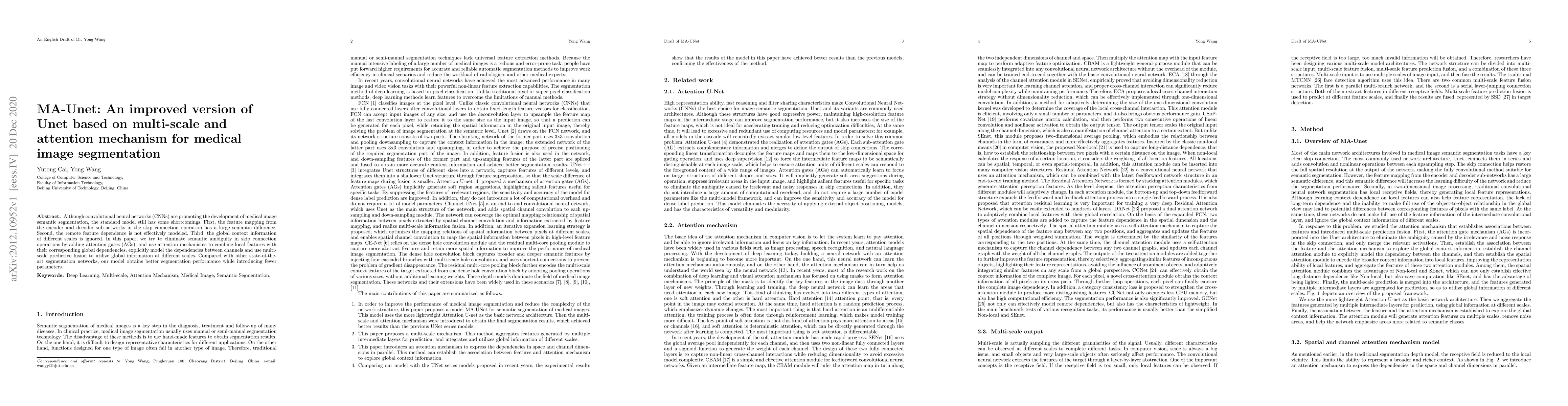 This paper proposes a new medical image segmentation model called MA-Unet that combines multi-scale and attention mechanisms to improve performance. It overcomes limitations of existing models by effectively modeling global context information and introducing fewer parameters while achieving better segmentation results.