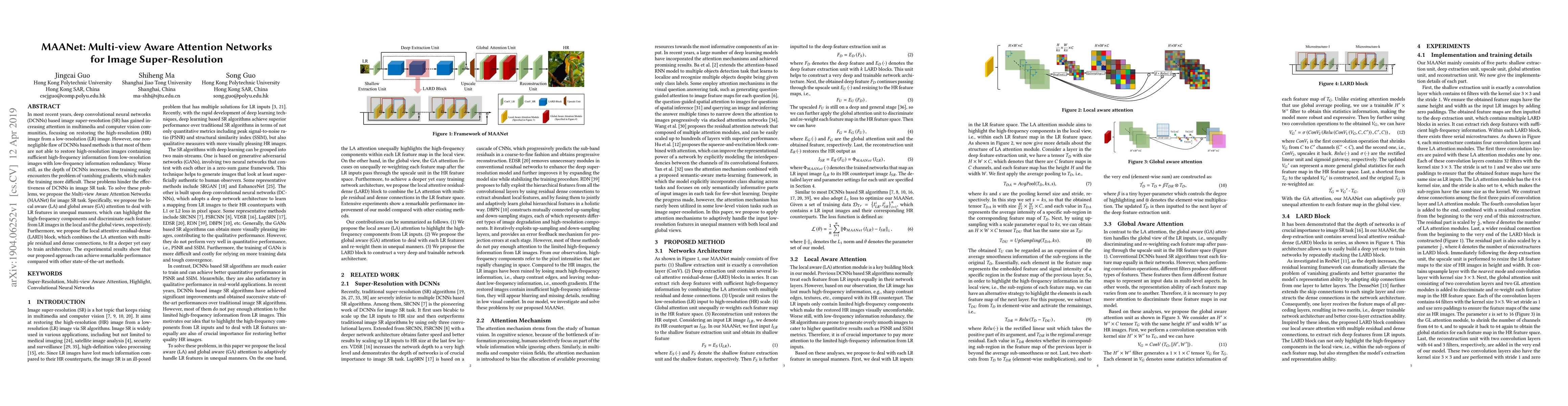 MAANet introduces Multi-view Aware Attention Networks to enhance image super-resolution by utilizing local and global attention mechanisms to highlight high-frequency details and improve training efficiency through a local attentive residual-dense block, achieving superior performance over existing methods.