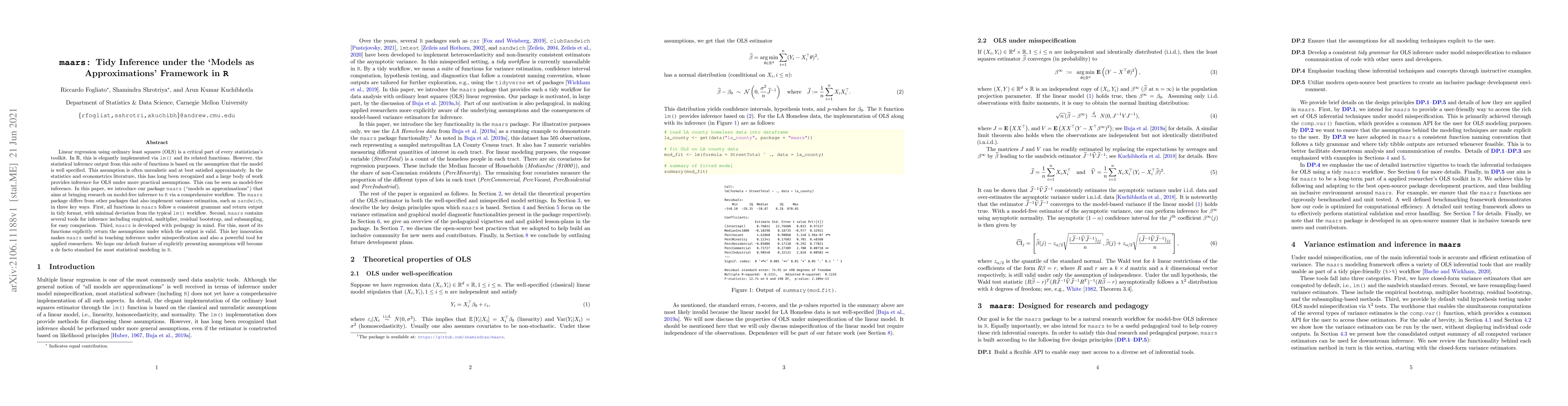 Linear regression using ordinary least squares (OLS) is a critical part of every statistician's toolkit. In R, this is elegantly implemented via lm() and its related functions. However, the statistical inference output from this suite of functions is based on the assumption that the model is well specified. This assumption is often unrealistic and at best satisfied approximately. In the statistics and econometrics literature, this has long been recognized and a large body of work provides inference for OLS under more practical assumptions. This can be seen as model-free inference. In this paper, we introduce our package maars ("models as approximations") that aims at bringing research on model-free inference to R via a comprehensive workflow. The maars package differs from other packages that also implement variance estimation, such as sandwich, in three key ways. First, all functions in maars follow a consistent grammar and return output in tidy format, with minimal deviation from the typical lm() workflow. Second, maars contains several tools for inference including empirical, multiplier, residual bootstrap, and subsampling, for easy comparison. Third, maars is developed with pedagogy in mind. For this, most of its functions explicitly return the assumptions under which the output is valid. This key innovation makes maars useful in teaching inference under misspecification and also a powerful tool for applied researchers. We hope our default feature of explicitly presenting assumptions will become a de facto standard for most statistical modeling in R.