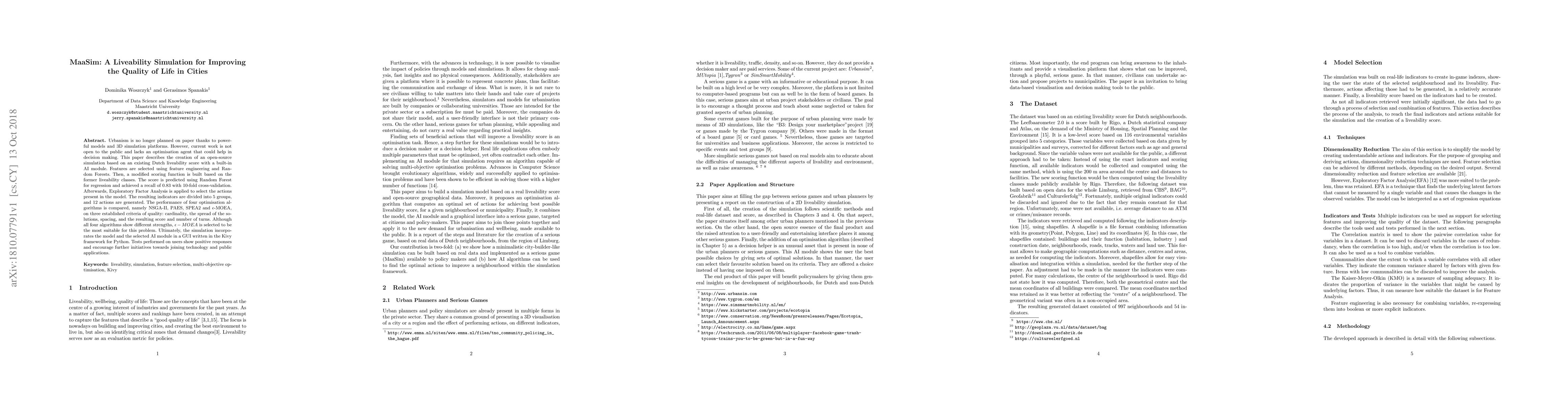 Urbanism is no longer planned on paper thanks to powerful models and 3D simulation platforms. However, current work is not open to the public and lacks an optimisation agent that could help in decision making. This paper describes the creation of an open-source simulation based on an existing Dutch liveability score with a built-in AI module. Features are selected using feature engineering and Random Forests. Then, a modified scoring function is built based on the former liveability classes. The score is predicted using Random Forest for regression and achieved a recall of 0.83 with 10-fold cross-validation. Afterwards, Exploratory Factor Analysis is applied to select the actions present in the model. The resulting indicators are divided into 5 groups, and 12 actions are generated. The performance of four optimisation algorithms is compared, namely NSGA-II, PAES, SPEA2 and eps-MOEA, on three established criteria of quality: cardinality, the spread of the solutions, spacing, and the resulting score and number of turns. Although all four algorithms show different strengths, eps-MOEA is selected to be the most suitable for this problem. Ultimately, the simulation incorporates the model and the selected AI module in a GUI written in the Kivy framework for Python. Tests performed on users show positive responses and encourage further initiatives towards joining technology and public applications.