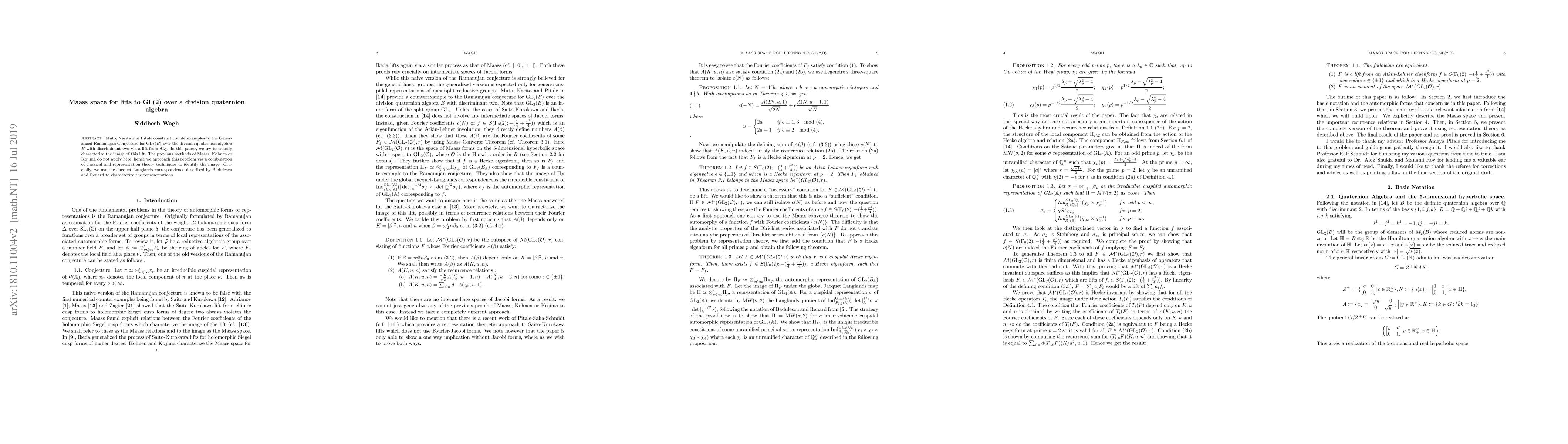 This paper constructs counterexamples to the Generalized Ramanujan Conjecture for GL(2) over a division quaternion algebra with discriminant two, identifying the image of a lift from SL(2). It employs classical and representation theory techniques, leveraging the Jacquet-Langlands correspondence to characterize the involved representations.