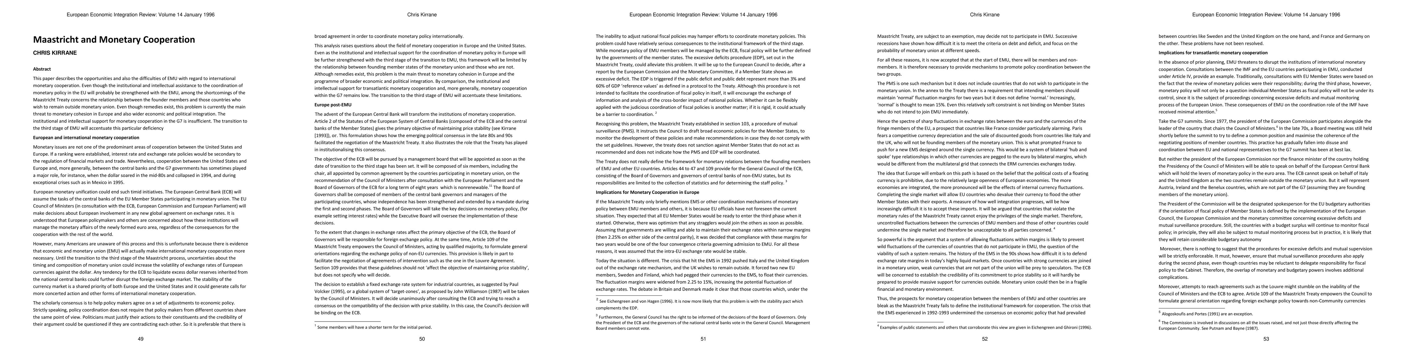 The paper explores the benefits and challenges of Economic and Monetary Union (EMU) in enhancing monetary cooperation within the EU, highlighting that while EMU may bolster policy coordination, the Maastricht Treaty's limitations, especially concerning the involvement of non-participating member states, need addressing.