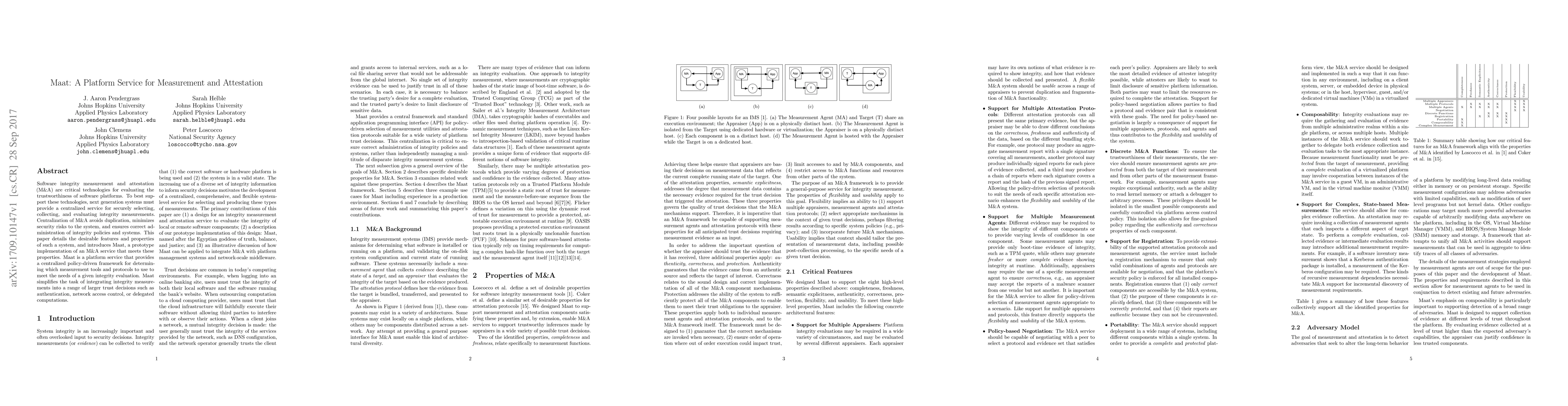 Software integrity measurement and attestation (M&A) are critical technologies for evaluating the trustworthiness of software platforms. To best support these technologies, next generation systems must provide a centralized service for securely selecting, collecting, and evaluating integrity measurements. Centralization of M&A avoids duplication, minimizes security risks to the system, and ensures correct ad- ministration of integrity policies and systems. This paper details the desirable features and properties of such a system, and introduces Maat, a prototype implementation of an M&A service that meets these properties. Maat is a platform service that provides a centralized policy-driven framework for determining which measurement tools and protocols to use to meet the needs of a given integrity evaluation. Maat simplifies the task of integrating integrity measurements into a range of larger trust decisions such as authentication, network access control, or delegated computations.