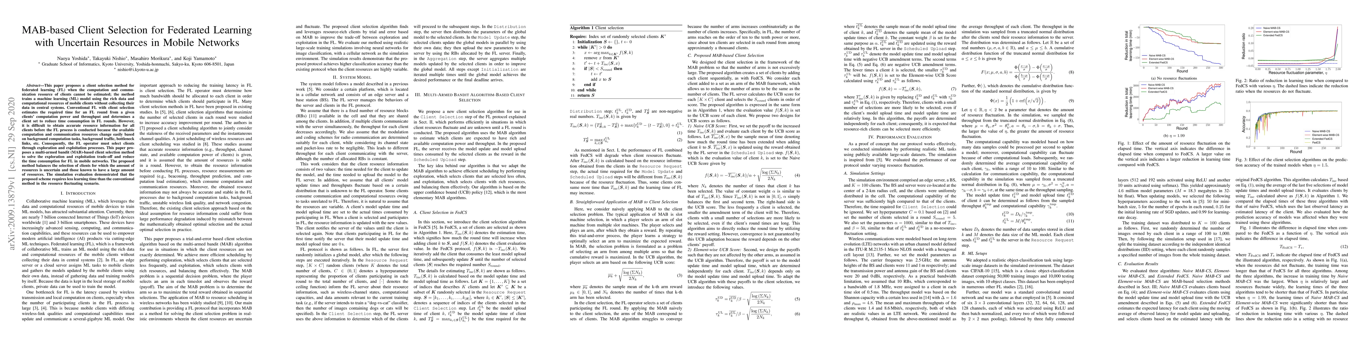 This paper proposes a multi-armed bandit (MAB)-based client selection method for federated learning in mobile networks where resource estimation is uncertain. The method balances exploration and exploitation to reduce learning time, demonstrating less time consumption compared to conventional methods.