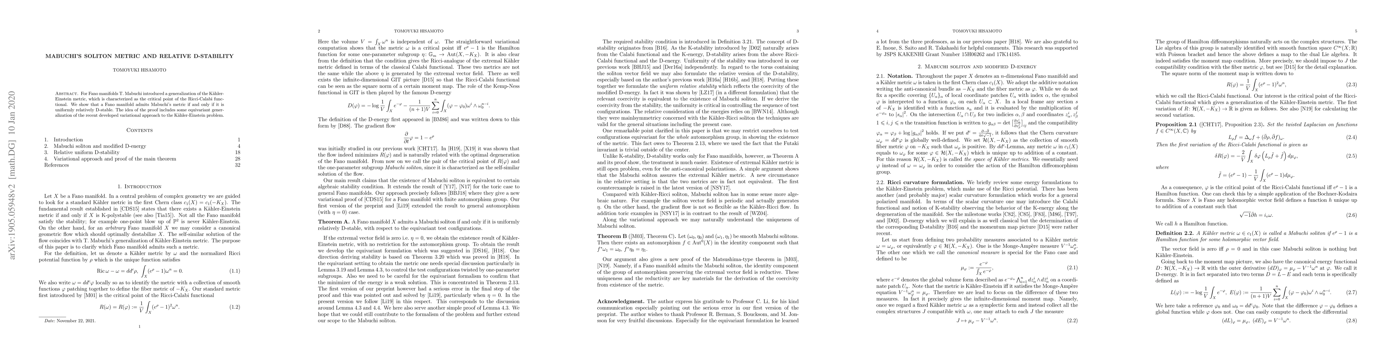 For Fano manifolds T. Mabuchi introduced a generalization of the K\"ahler-Einstein metric, which is characterized as the critical point of the Ricci-Calabi functional. We show that a Fano manifold admits Mabuchi's metric if and only if it is uniformly relatively D-stable.