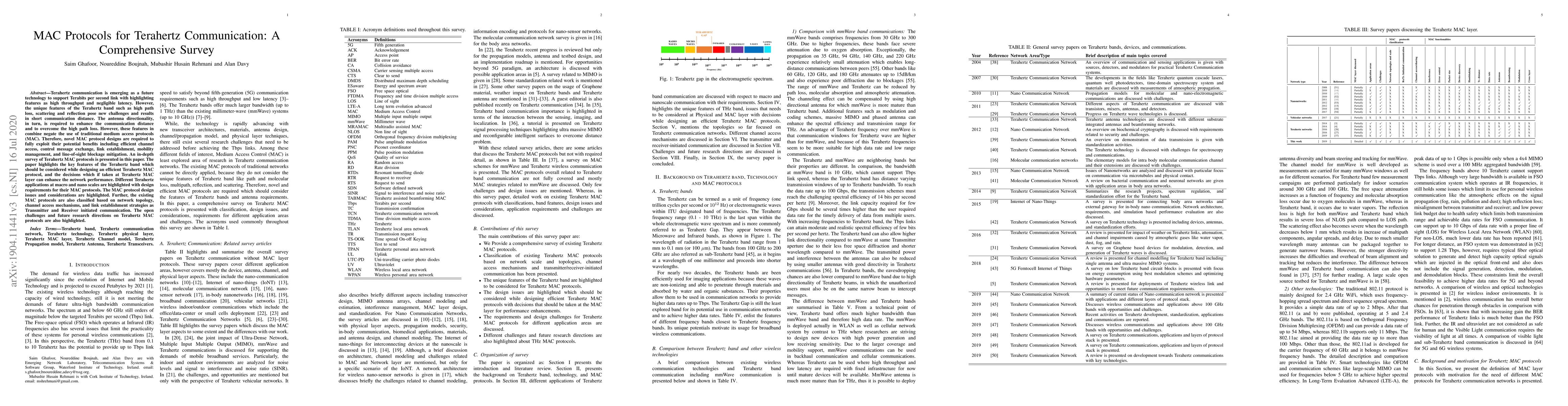 This paper provides a comprehensive survey of Medium Access Control (MAC) protocols for Terahertz communication, emphasizing the unique challenges and requirements of the Terahertz band. It discusses the necessity of novel MAC designs to address issues like high path loss and mobility management, and classifies existing protocols based on various strategies. The paper also outlines future research directions and open challenges in this field.