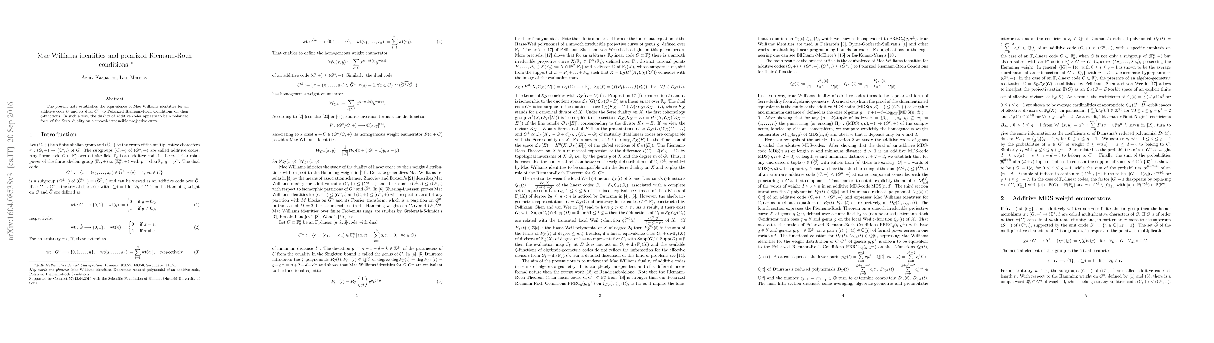 The present note establishes the equivalence of Mac Williams identities for an additive code C and its dual to Polarized Riemann-Roch Conditions on their Zeta-functions. In such a way, the duality of additive codes appears to be a polarized form of the Serre duality on a smooth irreducible projective curve.