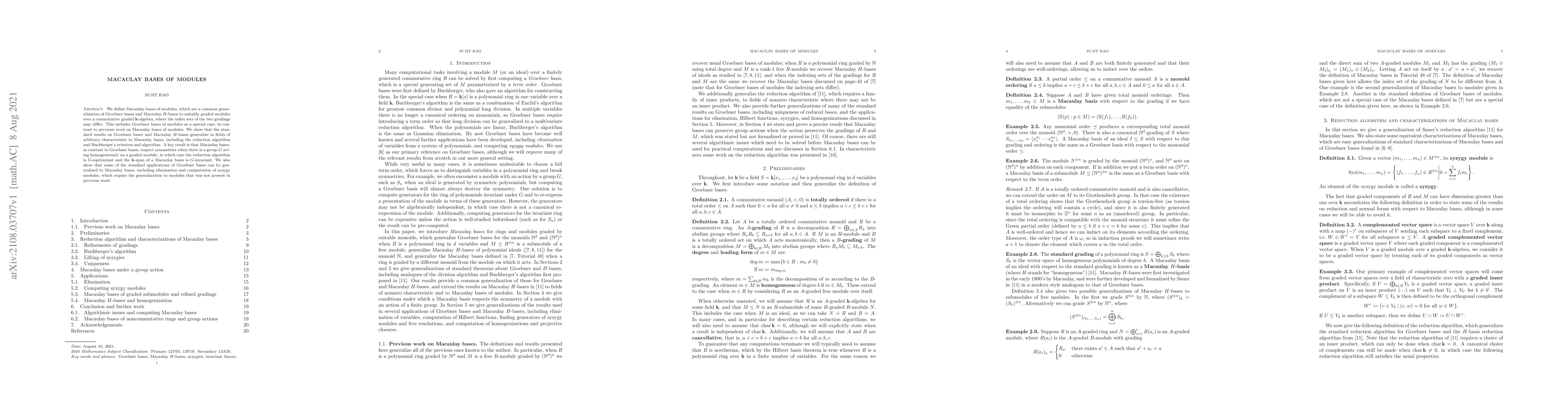We define Macaulay bases of modules, which are a common generalization of Groebner bases and Macaulay $H$-bases to suitably graded modules over a commutative graded $\mathbf{k}$-algebra, where the index sets of the two gradings may differ. This includes Groebner bases of modules as a special case, in contrast to previous work on Macaulay bases of modules. We show that the standard results on Groebner bases and Macaulay $H$-bases generalize in fields of arbitrary characteristic to Macaulay bases, including the reduction algorithm and Buchberger's criterion and algorithm. A key result is that Macaulay bases, in contrast to Groebner bases, respect symmetries when there is a group $G$ acting homogeneously on a graded module, in which case the reduction algorithm is $G$-equivariant and the $\mathbf{k}$-span of a Macaulay basis is $G$-invariant. We also show that some of the standard applications of Groebner bases can be generalized to Macaulay bases, including elimination and computation of syzygy modules, which require the generalization to modules that was not present in previous work.