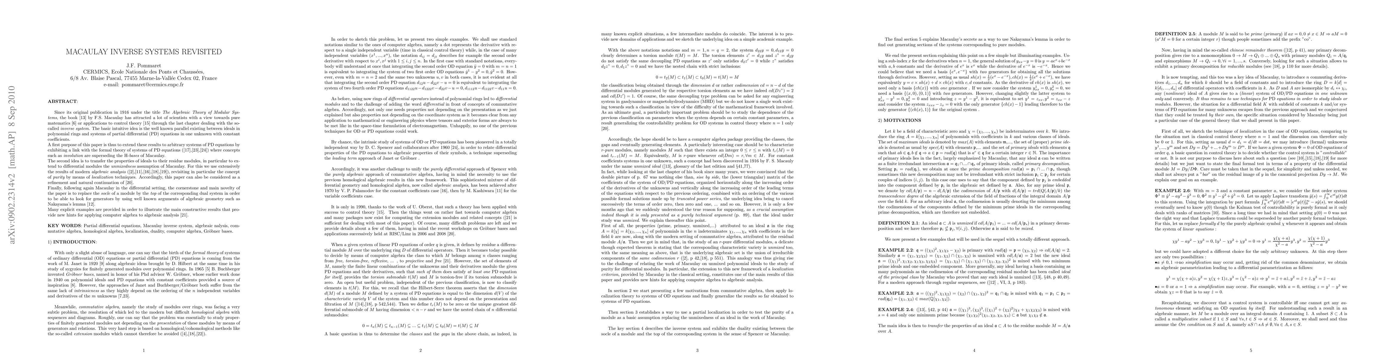 This paper revisits Macaulay's 1916 work on inverse systems in algebraic analysis, providing a detailed explanation for the first time within the framework of formal theory and its applications to control theory and computer algebra packages.