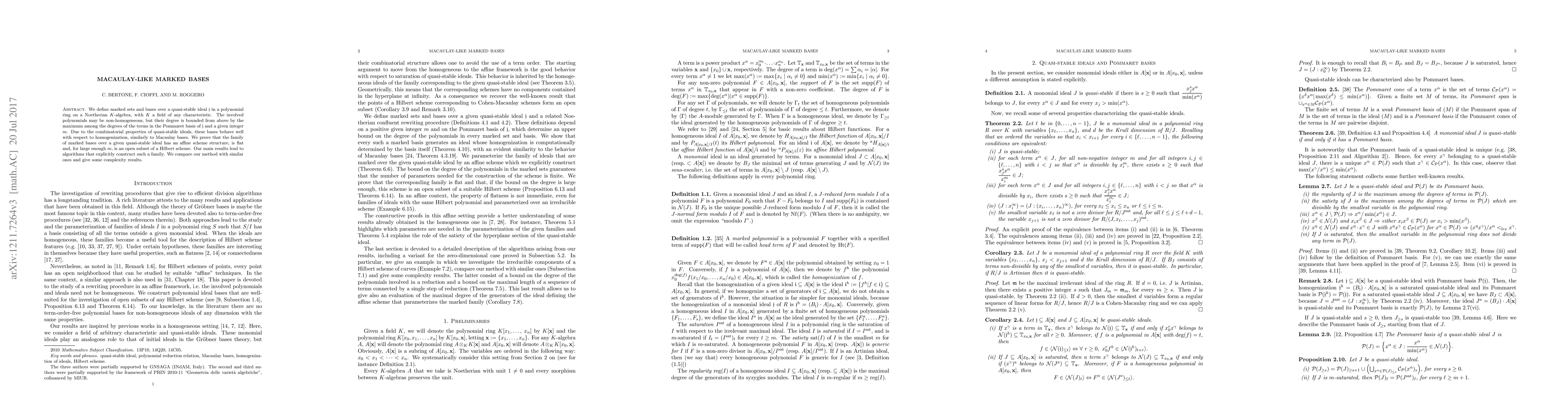 This paper introduces marked bases over quasi-stable ideals in polynomial rings, showing they behave similarly to Macaulay bases under homogenization. It proves these bases form an affine scheme, is flat, and for large enough parameters, is an open subset of a Hilbert scheme, leading to explicit construction algorithms.