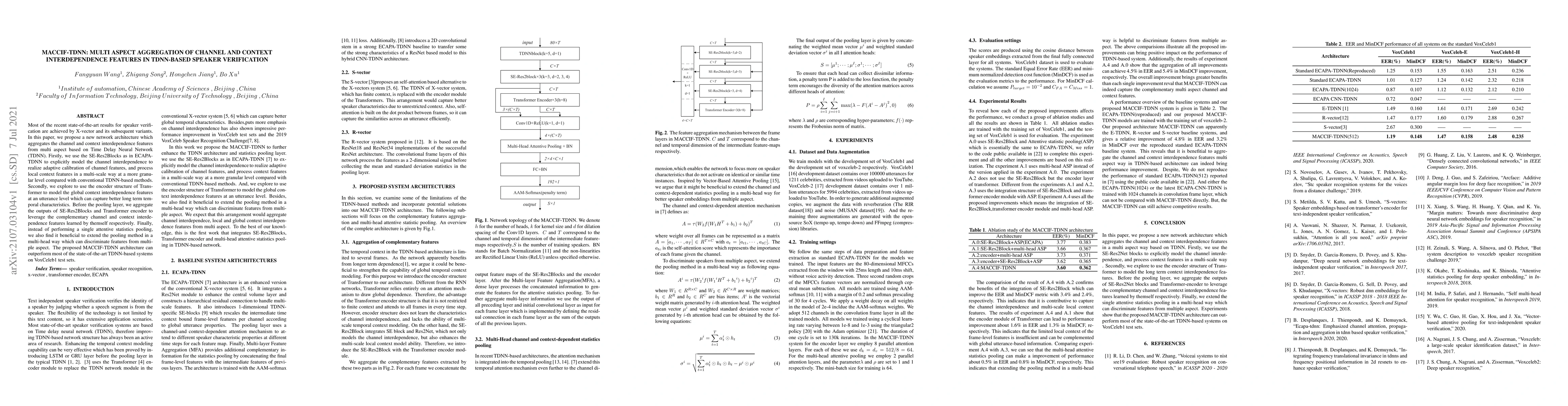 The paper proposes MACCIF-TDNN, a new network architecture that aggregates channel and context interdependence features using TDNN, combining SE-Res2Blocks for adaptive channel calibration and Transformer encoder for global context modeling, achieving superior performance in speaker verification on VoxCeleb1.