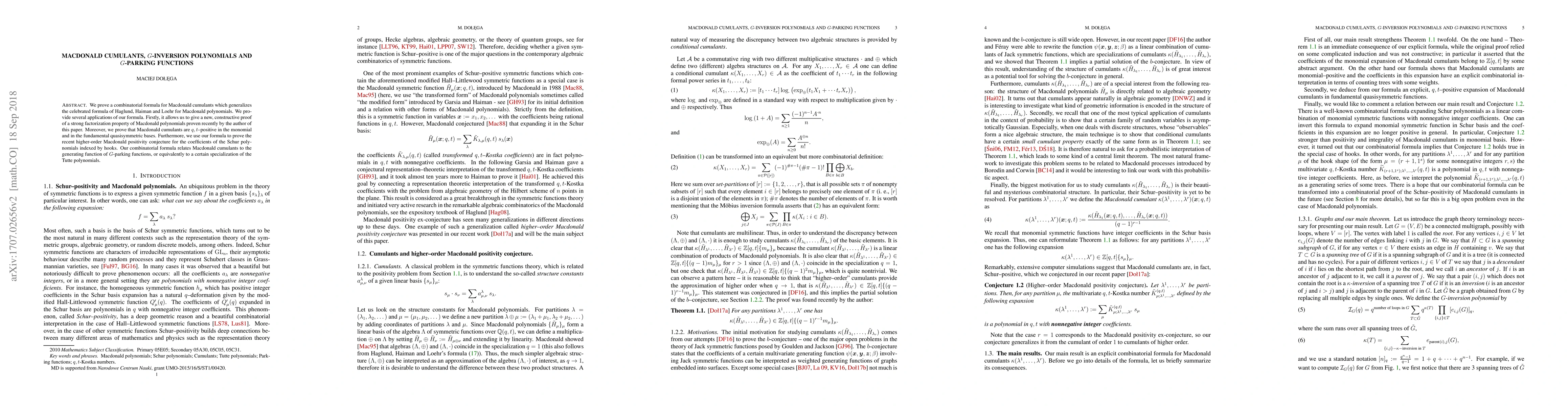 This paper proves a new combinatorial formula for Macdonald cumulants, generalizing Haglund's formula for Macdonald polynomials. It establishes $q,t$-positivity and provides a constructive proof for the factorization property of Macdonald polynomials, while also proving the higher-order Macdonald positivity conjecture for Schur polynomials indexed by hooks. The formula connects Macdonald cumulants to the generating function of $G$-parking functions.