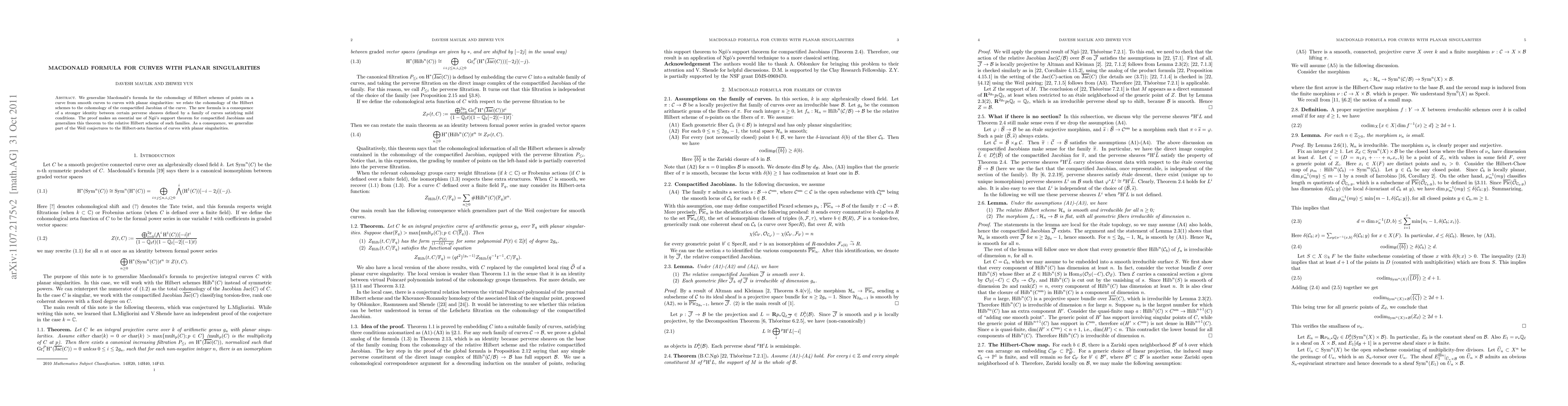 This paper generalizes Macdonald's formula for the cohomology of Hilbert schemes from smooth curves to those with planar singularities, linking their cohomologies to the compactified Jacobian. The new formula is derived from a stronger identity involving perverse sheaves and utilizes Ngo's support theorem, extending it to relative Hilbert schemes.