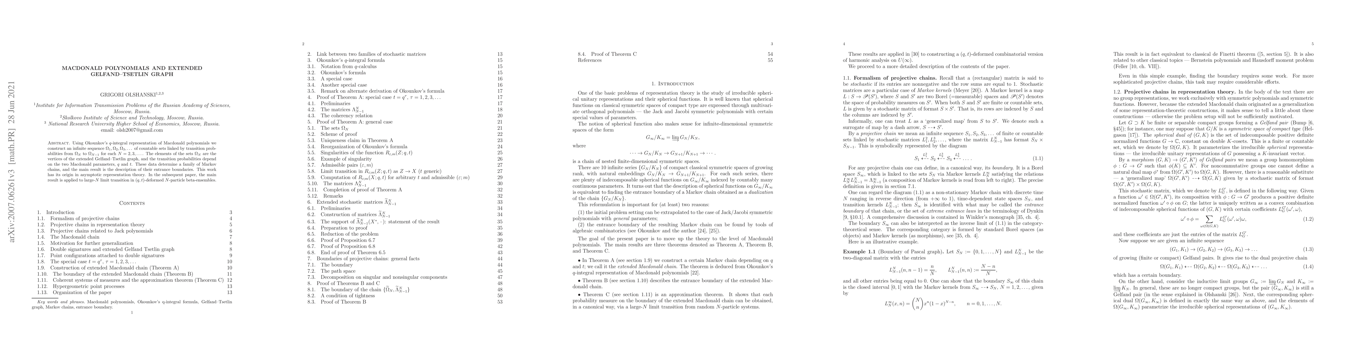Using Okounkov's $q$-integral representation of Macdonald polynomials we construct an infinite sequence $\Omega_1,\Omega_2,\Omega_3,\dots$ of countable sets linked by transition probabilities from $\Omega_N$ to $\Omega_{N-1}$ for each $N=2,3,\dots$. The elements of the sets $\Omega_N$ are the vertices of the extended Gelfand-Tsetlin graph, and the transition probabilities depend on the two Macdonald parameters, $q$ and $t$. These data determine a family of Markov chains, and the main result is the description of their entrance boundaries. This work has its origin in asymptotic representation theory. In the subsequent paper, the main result is applied to large-$N$ limit transition in $(q,t)$-deformed $N$-particle beta-ensembles.