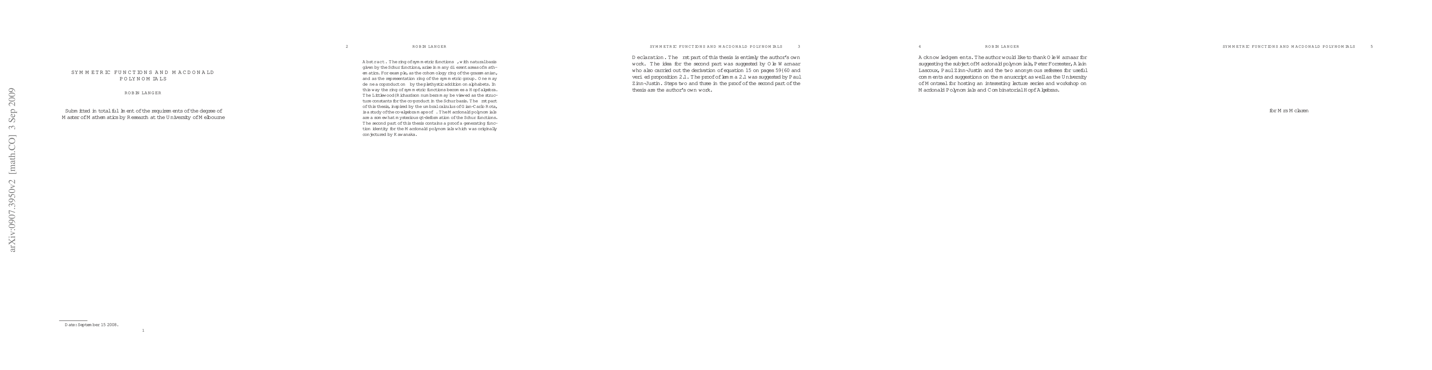 The ring of symmetric functions $\Lambda$, with natural basis given by the Schur functions, arise in many different areas of mathematics. For example, as the cohomology ring of the grassmanian, and as the representation ring of the symmetric group. One may define a coproduct on $\Lambda$ by the plethystic addition on alphabets. In this way the ring of symmetric functions becomes a Hopf algebra. The Littlewood--Richardson numbers may be viewed as the structure constants for the co-product in the Schur basis. In the first part of this thesis we show that by using a generalization of the classical umbral calculus of Gian-Carlo Rota, one may deform the basis of Schur functions to find many other bases for which the Littlewood--Richardson numbers as coproduct structure constants. The Macdonald polynomials are a somewhat mysterious qt-deformation of the Schur functions. The second part of this thesis contains a proof a generating function identity for the Macdonald polynomials which was originally conjectured by Kawanaka.
