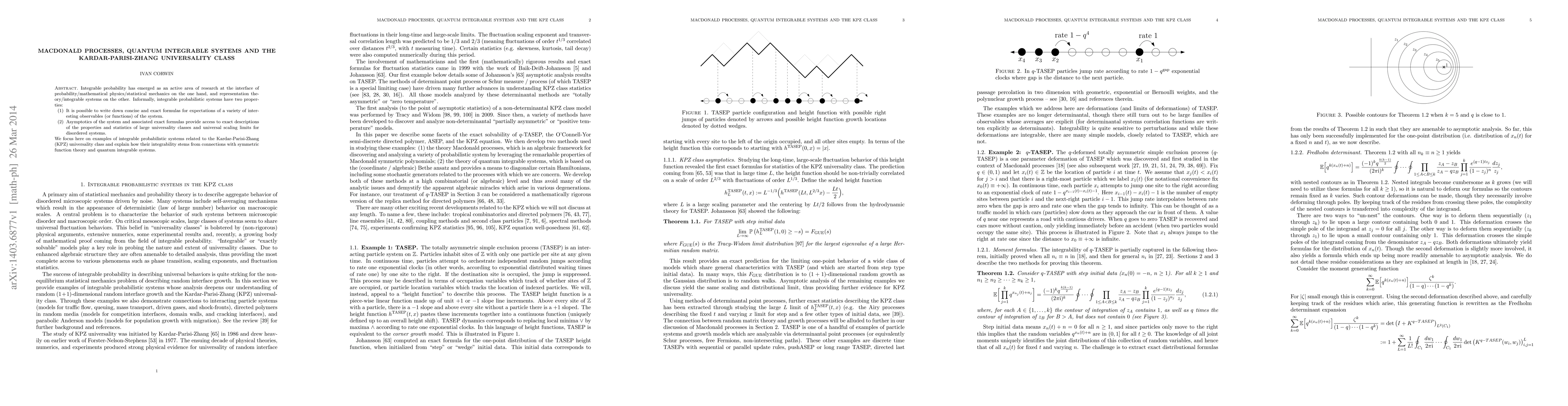 This paper explores the connections between Macdonald processes, quantum integrable systems, and the Kardar-Parisi-Zhang (KPZ) universality class, demonstrating how integrable probabilistic systems provide exact formulas for large-scale properties and universal scaling limits in disordered systems through links to symmetric function theory and quantum integrable systems.