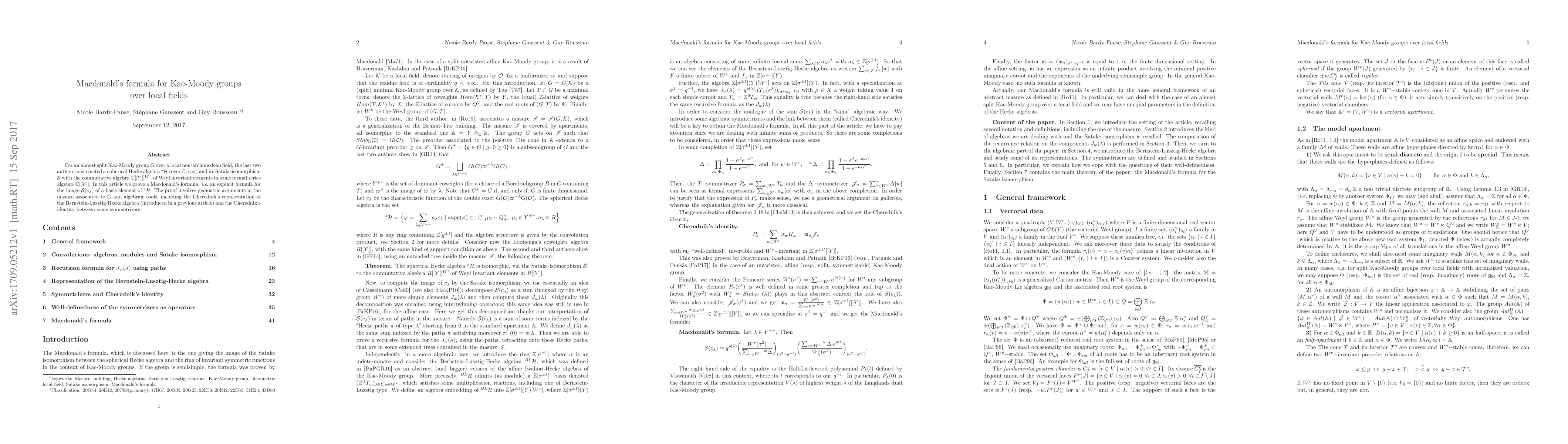 This research paper proves Macdonald's formula for Kac-Moody groups over local fields, providing an explicit formula for the image of a basis element of a spherical Hecke algebra. The proof combines geometric arguments with algebraic tools from representation theory.
