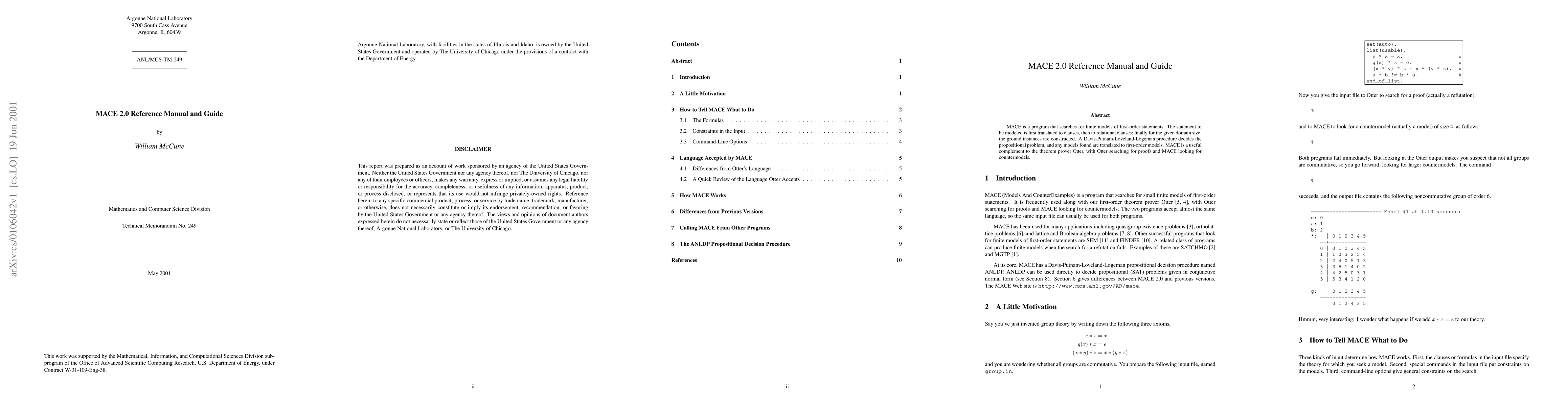MACE is a program that searches for finite models of first-order statements. The statement to be modeled is first translated to clauses, then to relational clauses; finally for the given domain size, the ground instances are constructed. A Davis-Putnam-Loveland-Logeman procedure decides the propositional problem, and any models found are translated to first-order models. MACE is a useful complement to the theorem prover Otter, with Otter searching for proofs and MACE looking for countermodels.