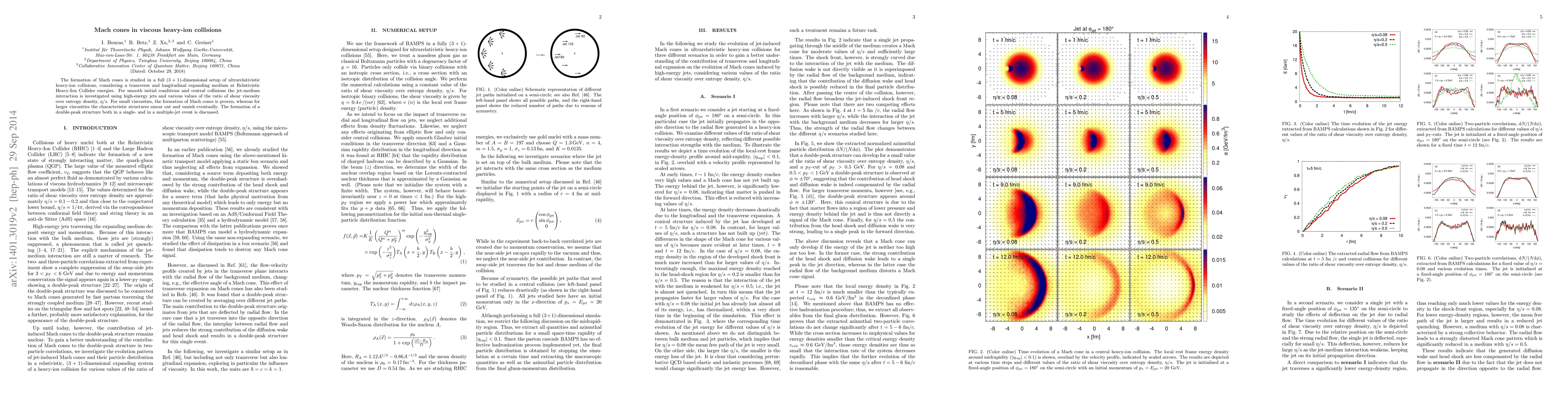 This study investigates Mach cone formation in viscous heavy-ion collisions using a $(3+1)$-dimensional model, revealing that small viscosities lead to clear Mach cone structures, while larger viscosities cause these structures to smear out and disappear. The research also explores the double-peak structure in both single and multiple jet events.