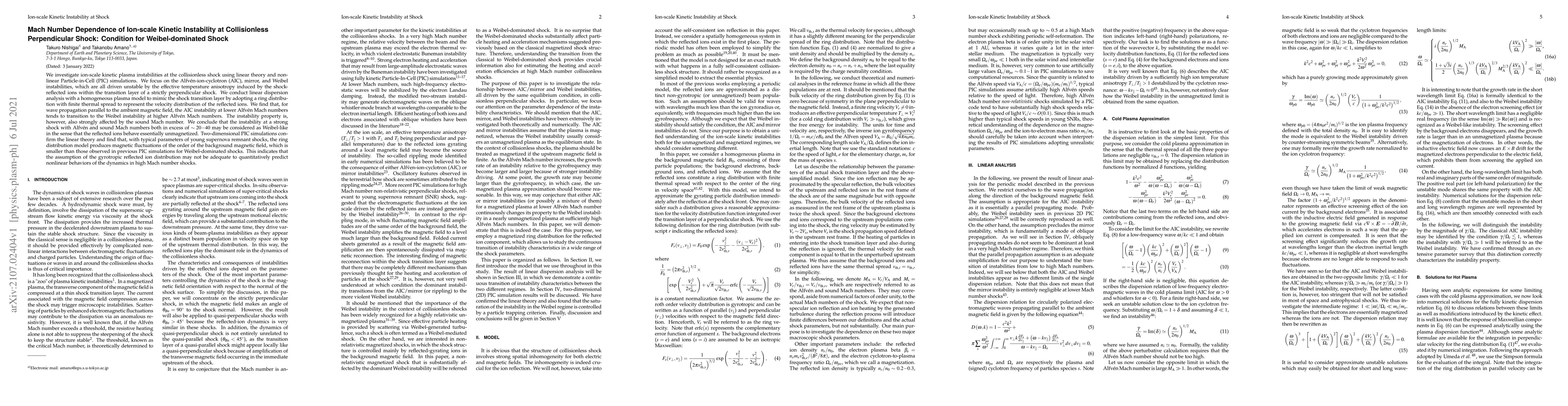 This paper examines ion-scale kinetic instabilities at collisionless perpendicular shocks, finding that the Alfv\'en-ion-cyclotron instability transitions to the Weibel instability at higher Alfv\'en Mach numbers. The study concludes that strong shocks with Alfv\'en and sound Mach numbers exceeding 20-40 exhibit Weibel-like behavior, with nonlinear simulations showing reduced magnetic fluctuations compared to previous models.