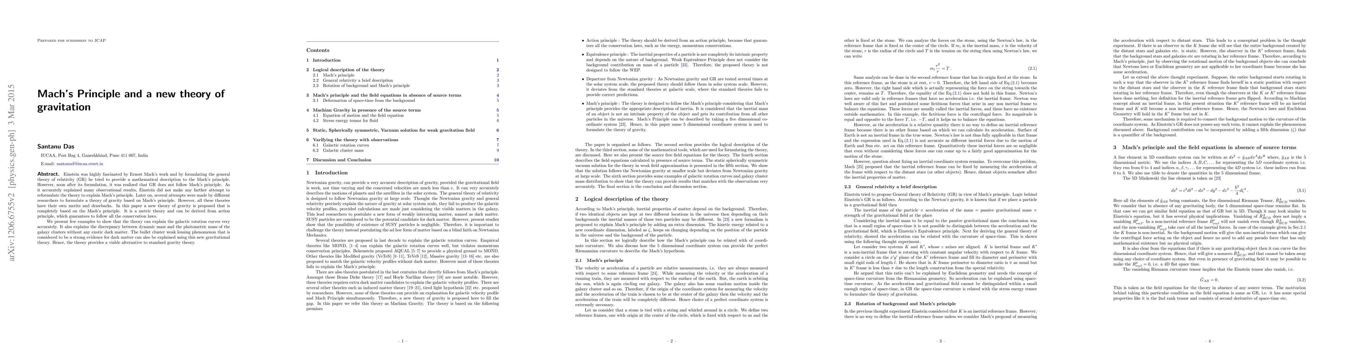 Einstein was highly fascinated by Ernest Mach's work and by formulating the general theory of relativity (GR) he tried to provide a mathematical description to the Mach's principle. However, soon after its formulation, it was realized that GR does not follow Mach's principle. As it accurately explained many observational results, Einstein did not make any farther attempt to reformulate the theory to explain Mach's principle. Later on, several attempts were made by different researchers to formulate a theory of gravity based on Mach's principle. However, all these theories have their own merits and drawbacks. In this paper a new theory of gravity is proposed that is completely based on the Mach's principle. It is a metric theory and can be derived from action principle, which guarantees to follow all the conservation laws. We present few examples to show that the theory can explain the galactic rotation curves very accurately. It also explains the discrepancy between dynamic mass and the photo-metric mass of the galaxy clusters without any exotic dark matter. The bullet cluster weak lensing phenomenon that is considered to be a strong evidence for dark matter can also be explained using this new gravitational theory. Hence, the theory provides a viable alternative to standard gravity theory.